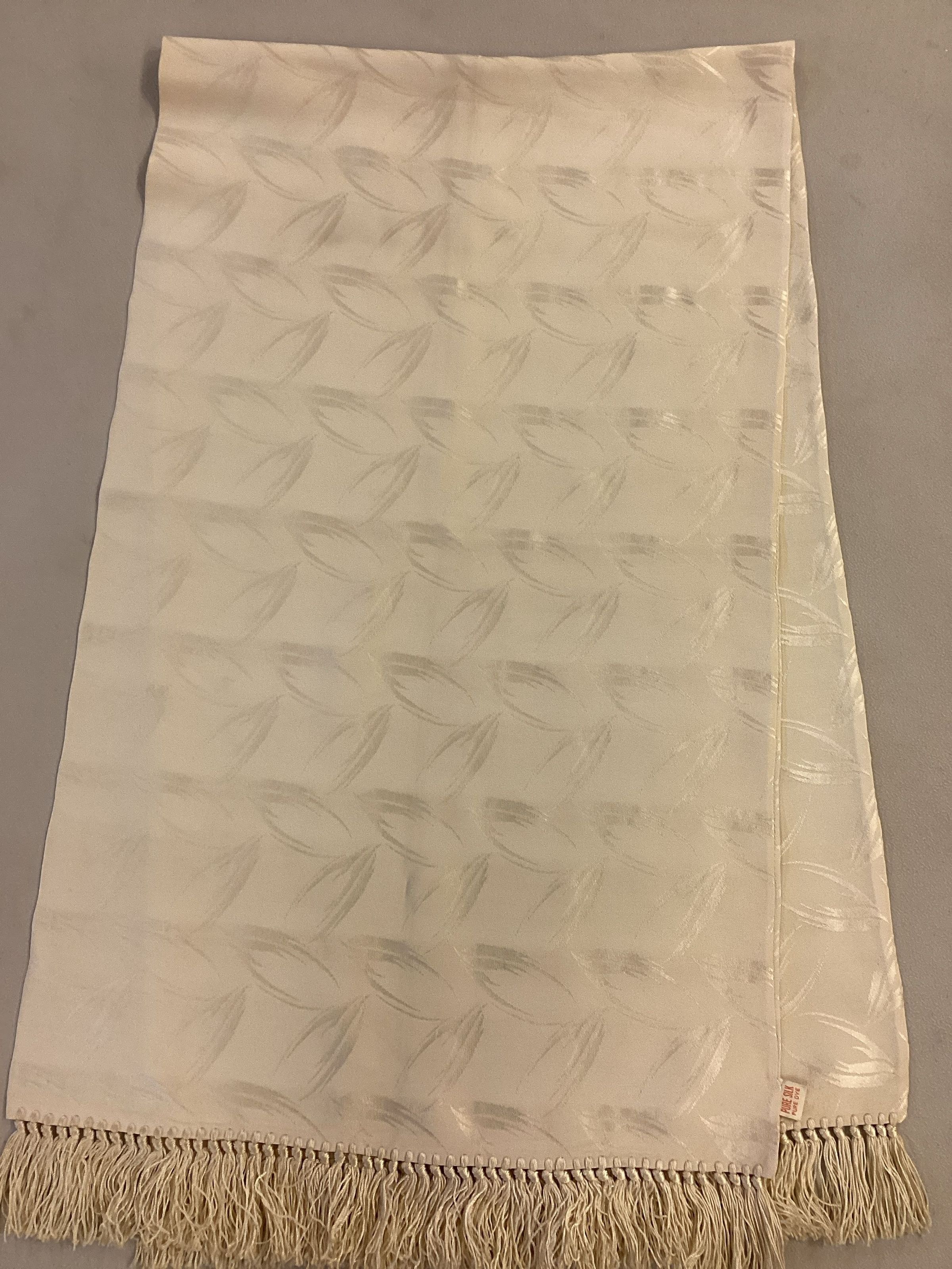 Beige silk damask material, 50” long, 14 1/2” wide, possibly a table or bureau scarf. Knotted fringe at both edges.Collection
