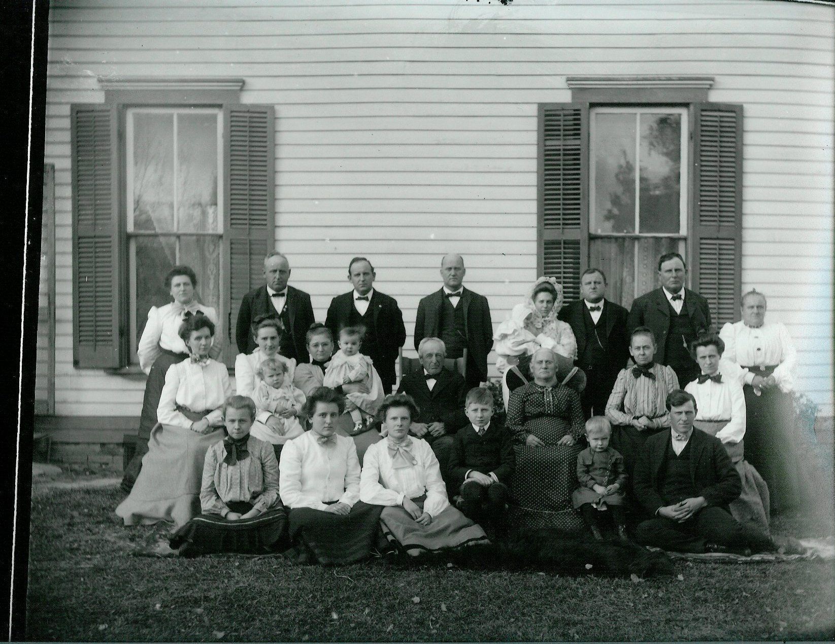 Black and white photographic print in landscape format. Family group of 24 people arranged in 3 rows. Photographed outside with a clapboard house and shuttered windows as background. Front row seated on rugs on ground, 3 females on left, then 2 children on little stools, an adult male in 3-piece suit on right end. Middle row seated on chairs, all female but one elderly man in middle, two women holding children. Back row is standing, 5 men in 3-piece suits and 3 women. Woman in middle wearing a hood and holding a baby. Print has been made from this neg, same access. Envelope was inscribed: "Scudder family group 1903." ******See also 86.1.139, same family in glass neg & print.Collection