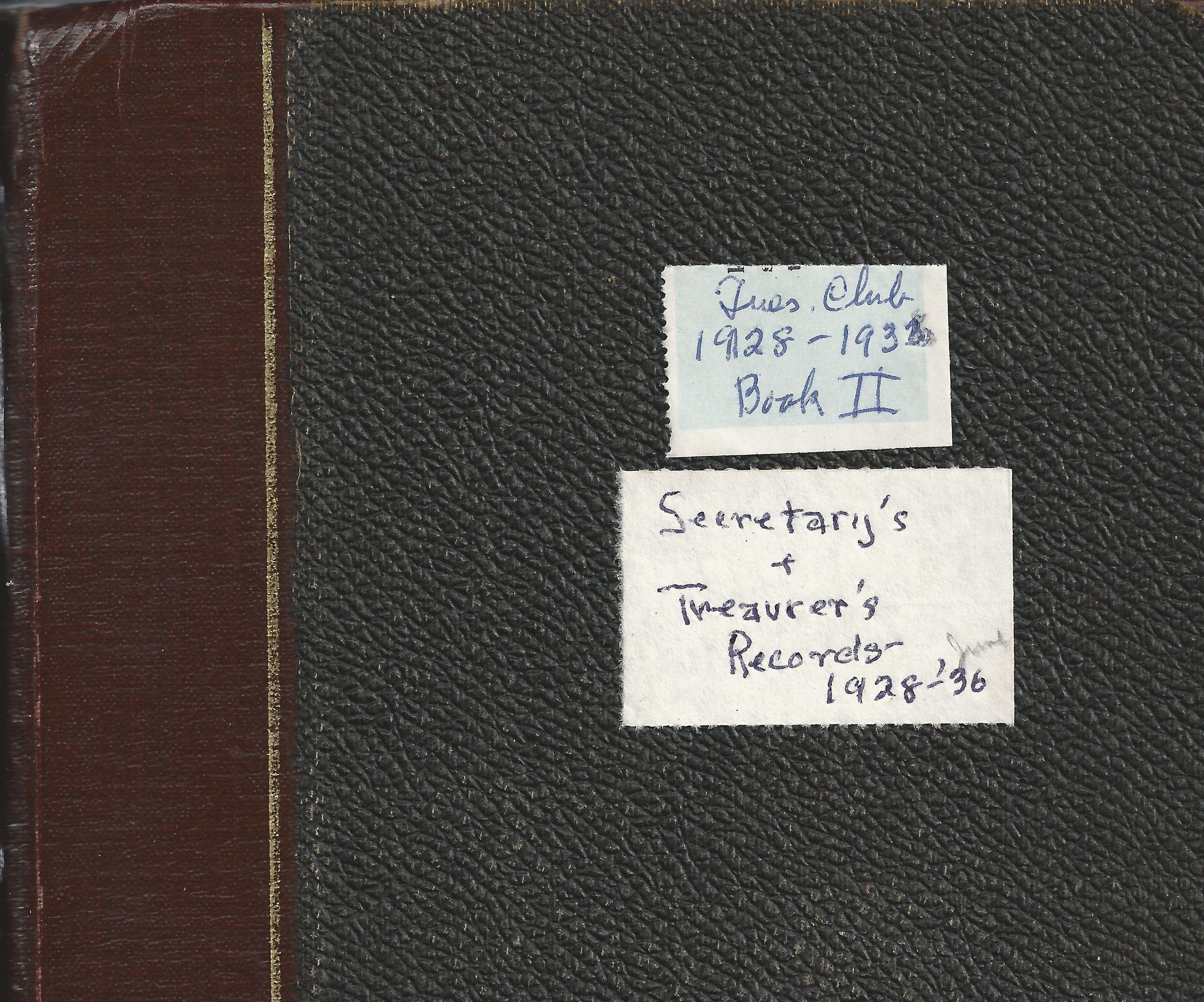 A dark leather record book of the Fountaintown Tuesday Club's Secretary and Treasurer records. The book has gilded accenting. On the center of the front cover, in gold type, reads: RECORD. Two hand-written sticker labels affixed to the front cover read: Tues. Club / 1928-1933 / Book II / Secretary's / + / Treasurer's / Records- / 1928- '36.Collection