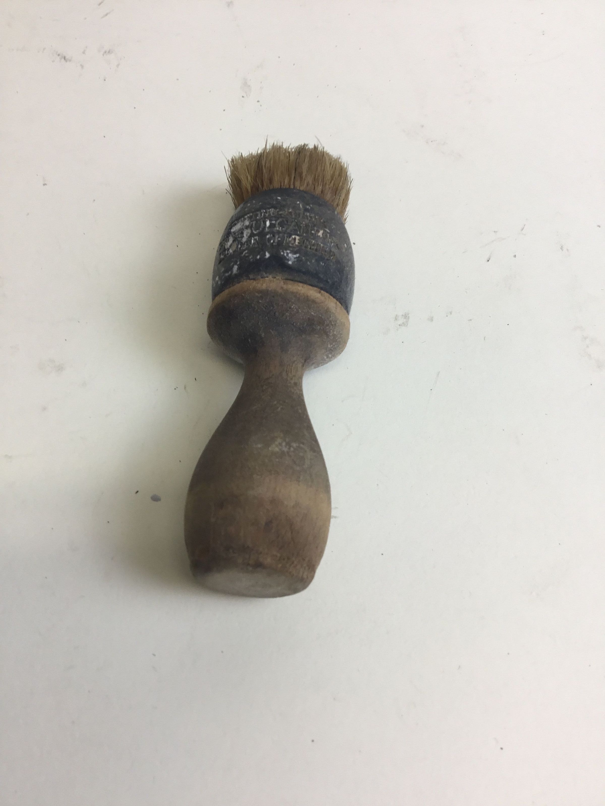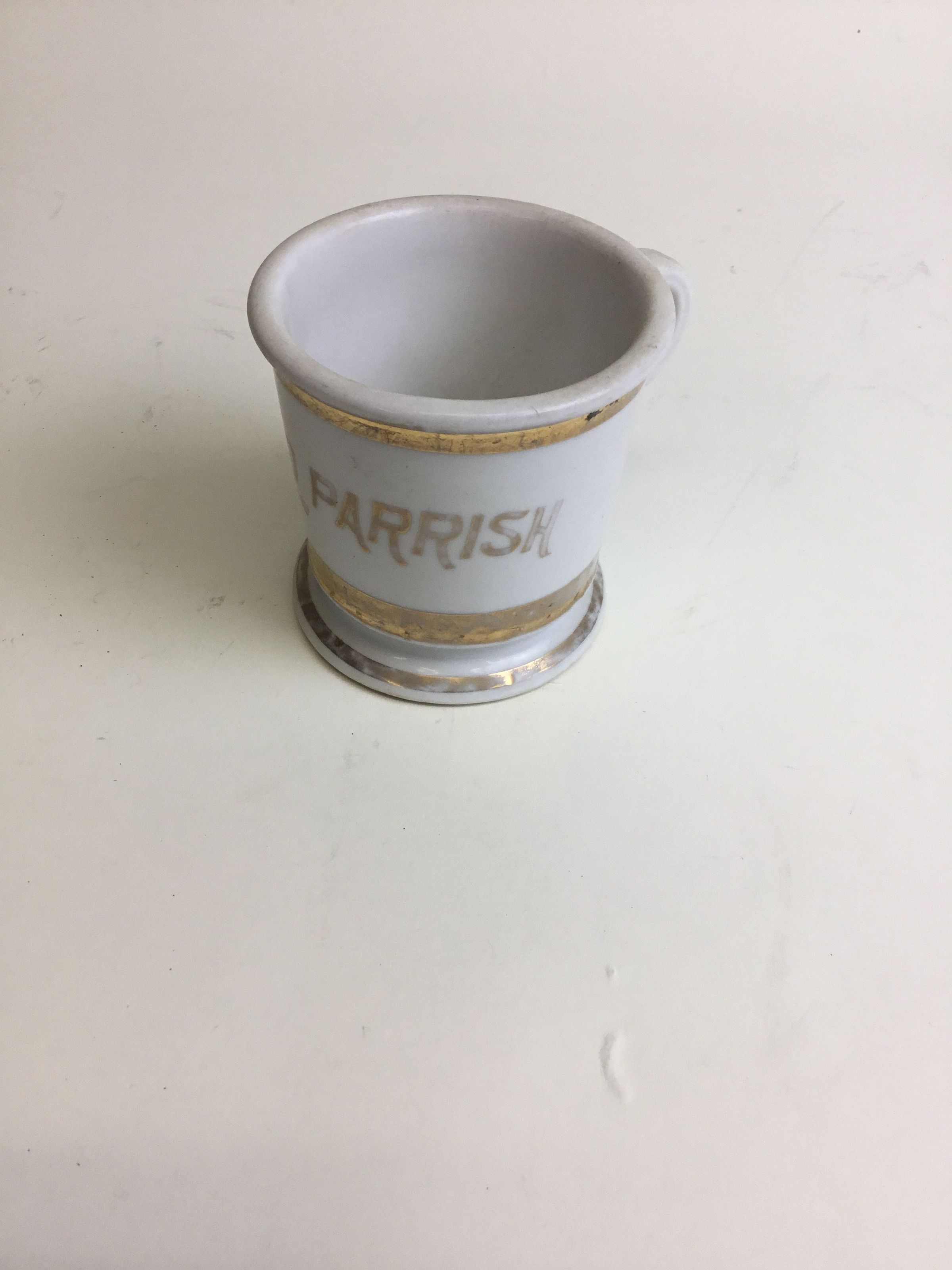 A. Shaving cup, white ceramic with gold colored bands around top and bottom. The name Willard Parrish is printed in gold.