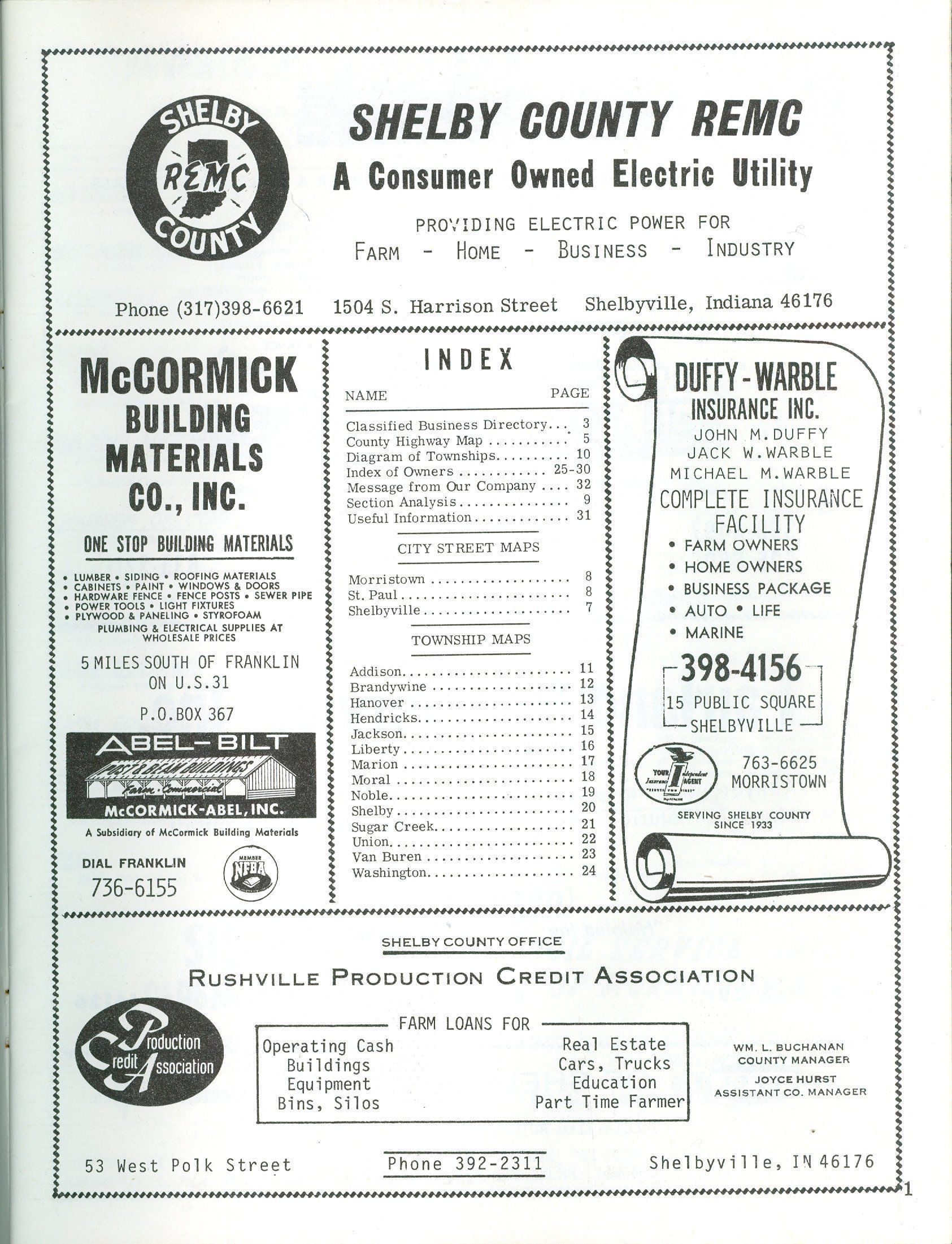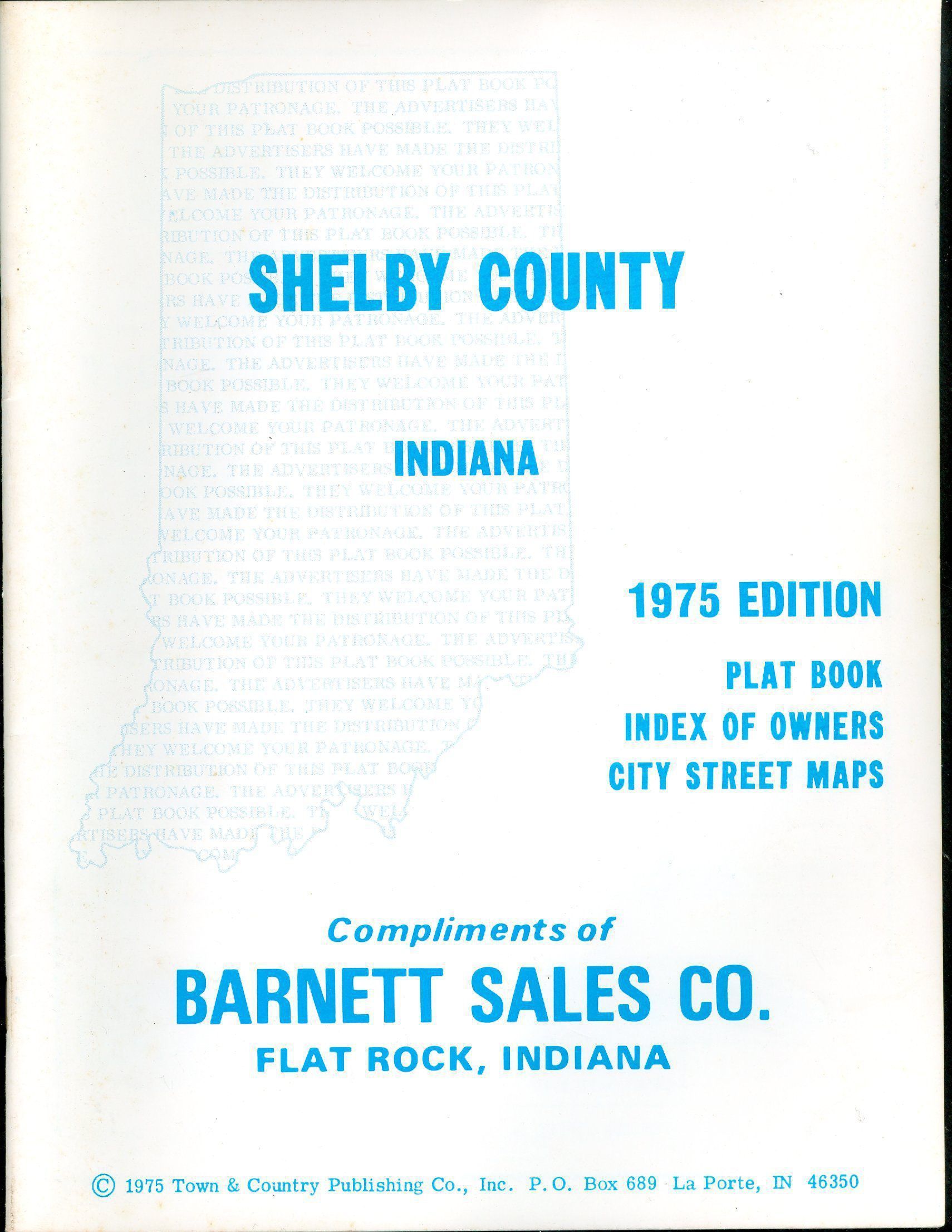 Sheby County/Indiana/1975 Edition/Plat Book/Index of Owners/City Street Maps/Compliments of/Barnett Sales Co./Flat Rock, Indiana/Description