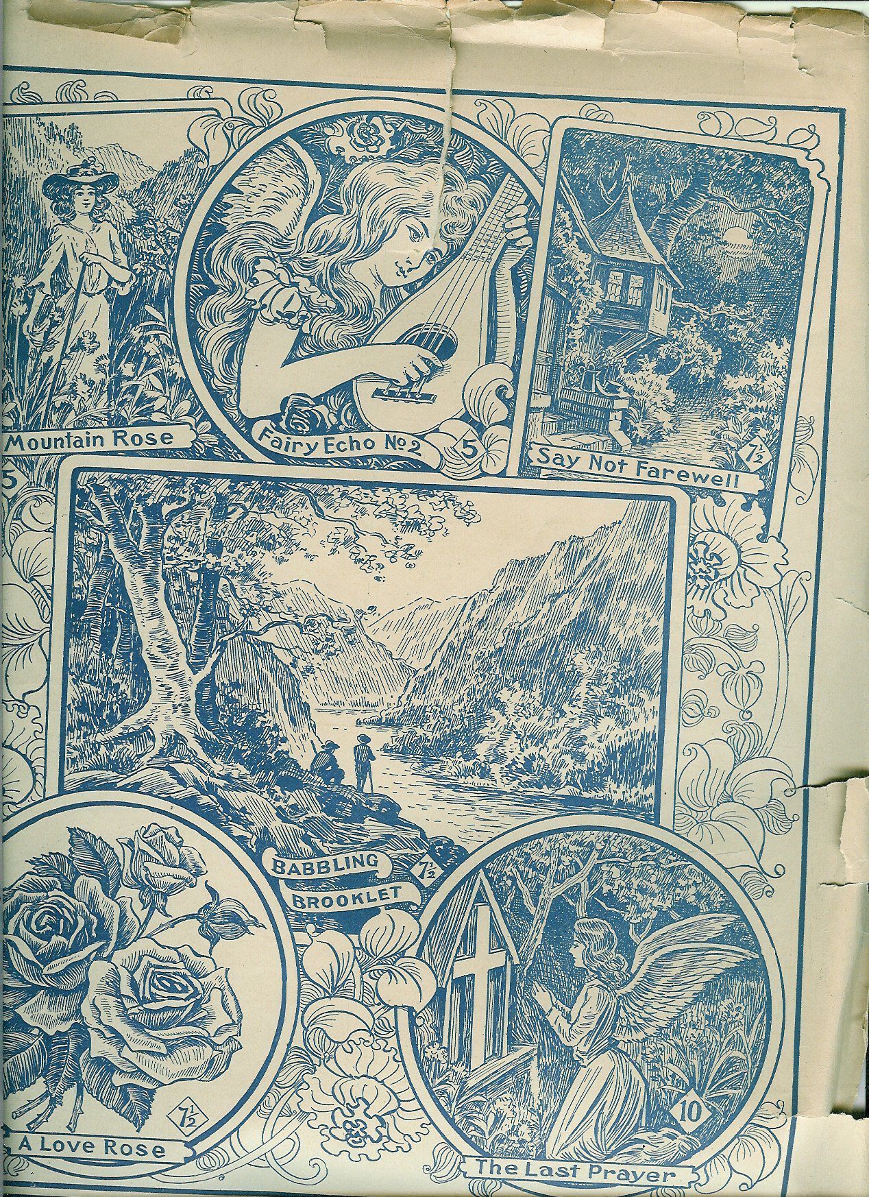 6 different pictures on the front, girl with large hat standing in flowers, angel with long hair playing an instrument, side of a house with a balcony, two boys by a brook, roses, angel praying in front of a cross. Last is 103 but pages 31-62 are missing.Collection