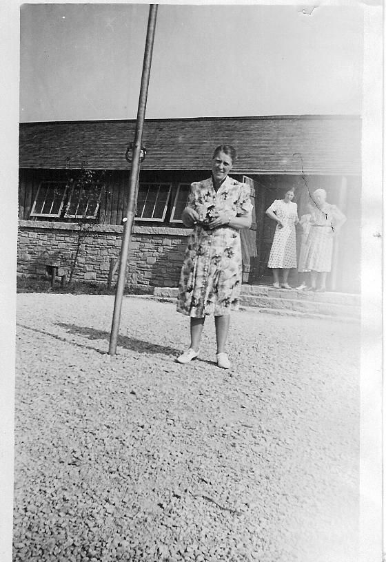 5" x 3.5" black and white glossy photo in portrait format. Image shows a woman standing by a flag pole in front of the mess hall at a camp in Versailles. Two other women stand in the doorway of the hall. Woman identifies as Miss Spencer on the back of the photo.Collection