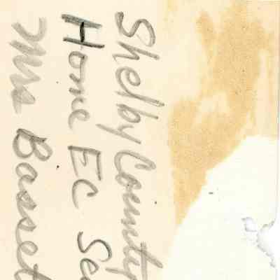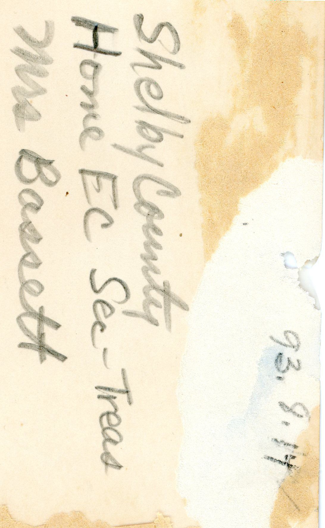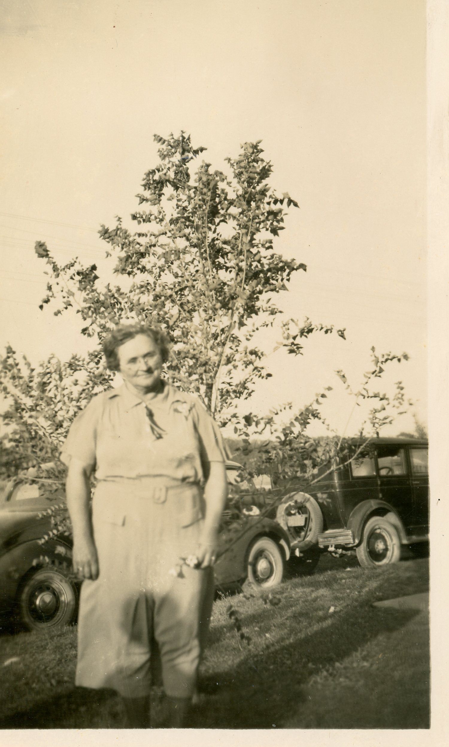 4.5" x 2.75" black and white glossy photo in portrait format. Image shows a woman, identified as Mrs. Bassett on the back of the photo, in a light colored dress standing in front of two cars and a single tree.Collection