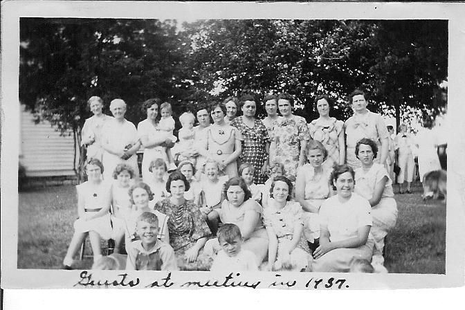 2.75" x 4.5" black and white glossy photo in landscape format. Image shows a group of guests at a Shelby Co Home Ec Meeting. White house or church in background.Collection