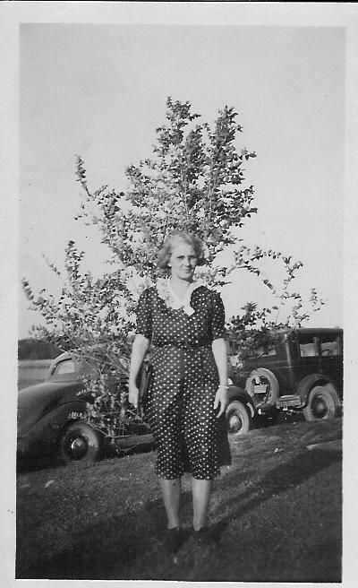 2.75" x 4.5" black and white glossy photo in portrait format. Image shows the president of the Shelby Co. Home Ec. Club, Mrs. Parker, wearing a polka dot dress and standing in front of two cars.Collection