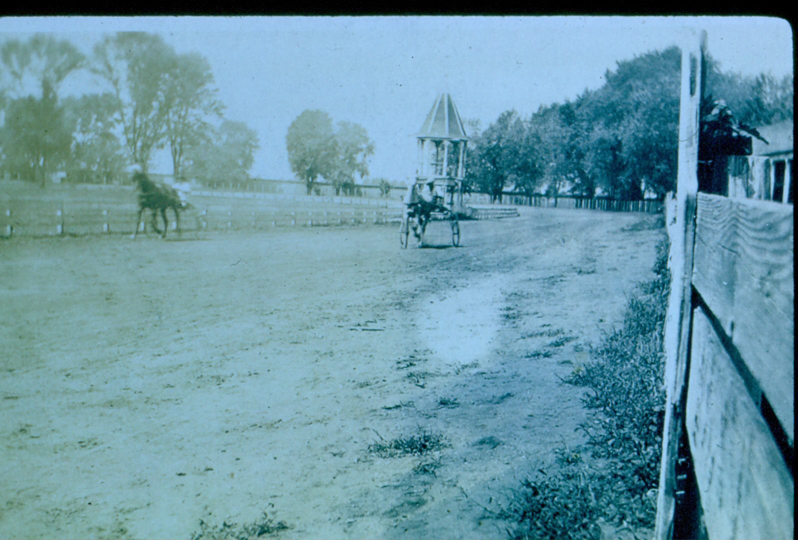 Donation, 07/26/2005. Black and white photographic slide in landscape format. Slide frame is marked: "Fairground." Image is of horses on race track.Collection