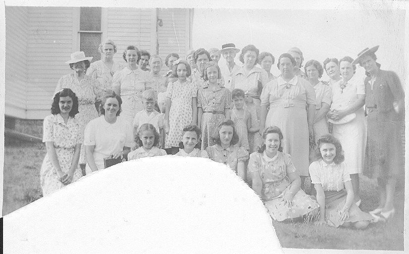 4.25" x 2.5" glossy, sepia photo in landscape format. Image shows a group of ladies, girls, and young children posed in front of a white house or church located in the upper left corner of the photo.Collection