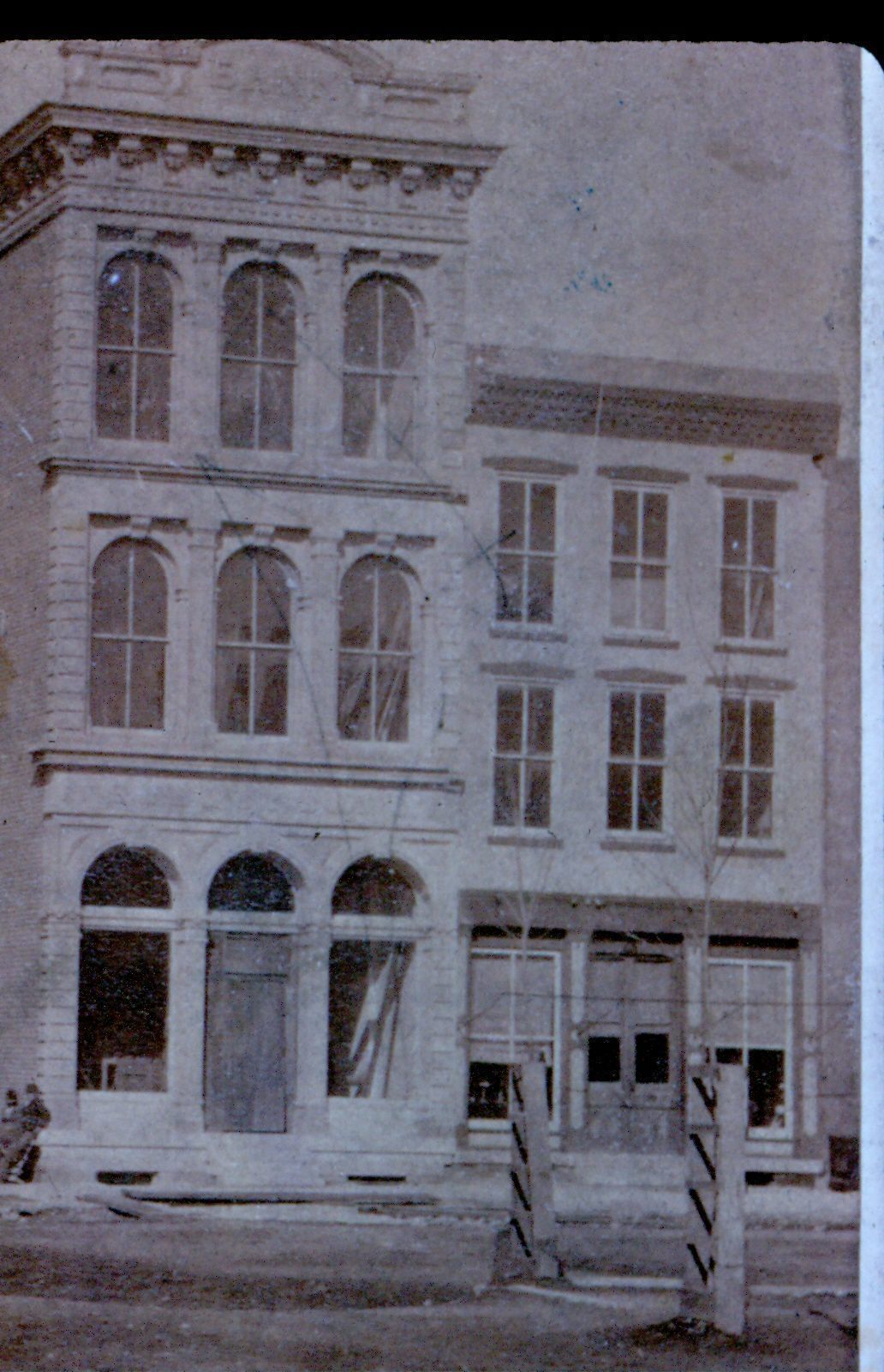 Donation, 07/26/2005. Black and white photographic slide in portrait format. Slide frame is marked: "Shelby Nat'l Bank/1873/S. Harrison."Collection