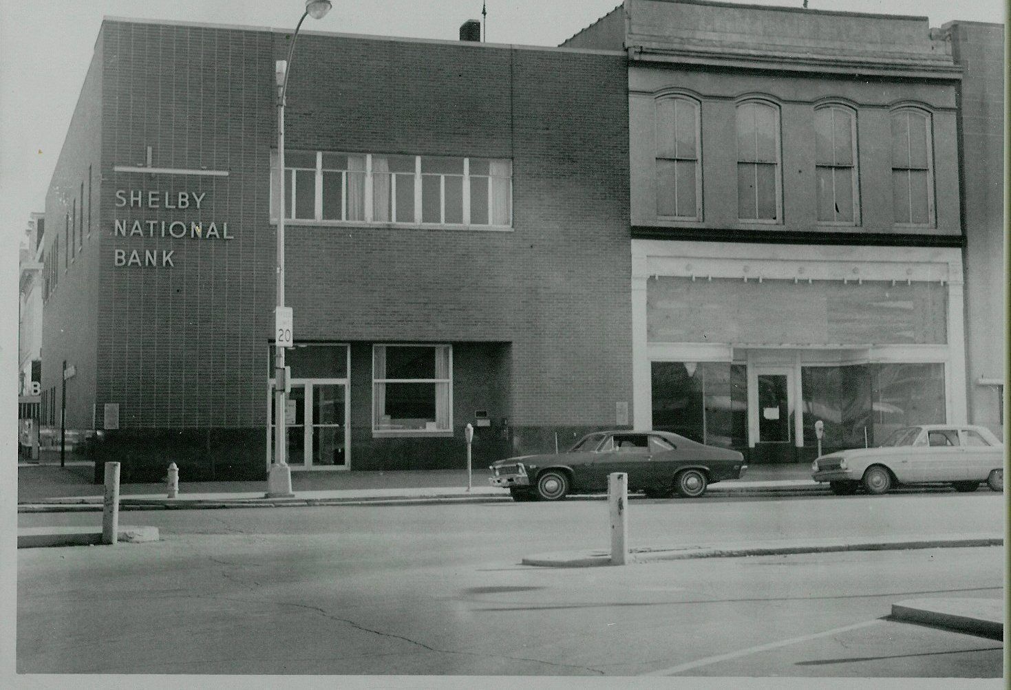 A: Exterior Shelby Nat'l Bank. B: Remodeled exterior of SNB C: Interior SNB