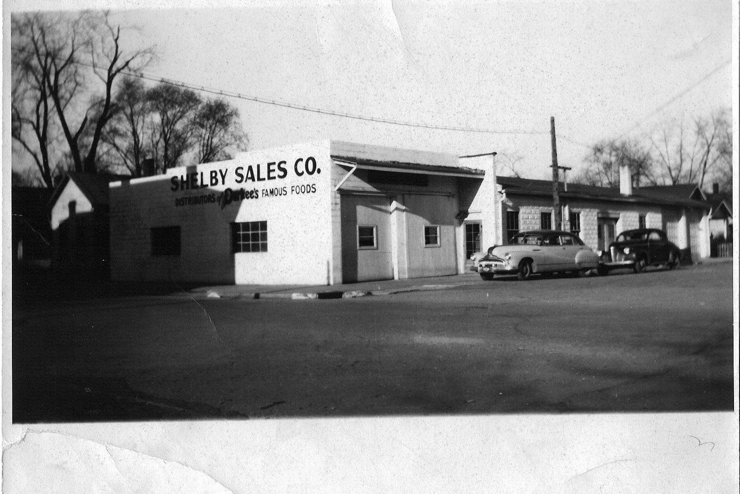 Donation, 07/26/2005. Black and white matte photographic print in landscape format. Image of long white building of brick and concrete block with sliding garage doors on left end. Two automobiles parked at curb. On left end of building in black: "Shelby Sales Co./Distributors of Durkie's Famous Foods". On back in blue ink: "N. E. Corner Vine & Washington about 1950/Dawson King and Floyd Angel Proprietors".Collection