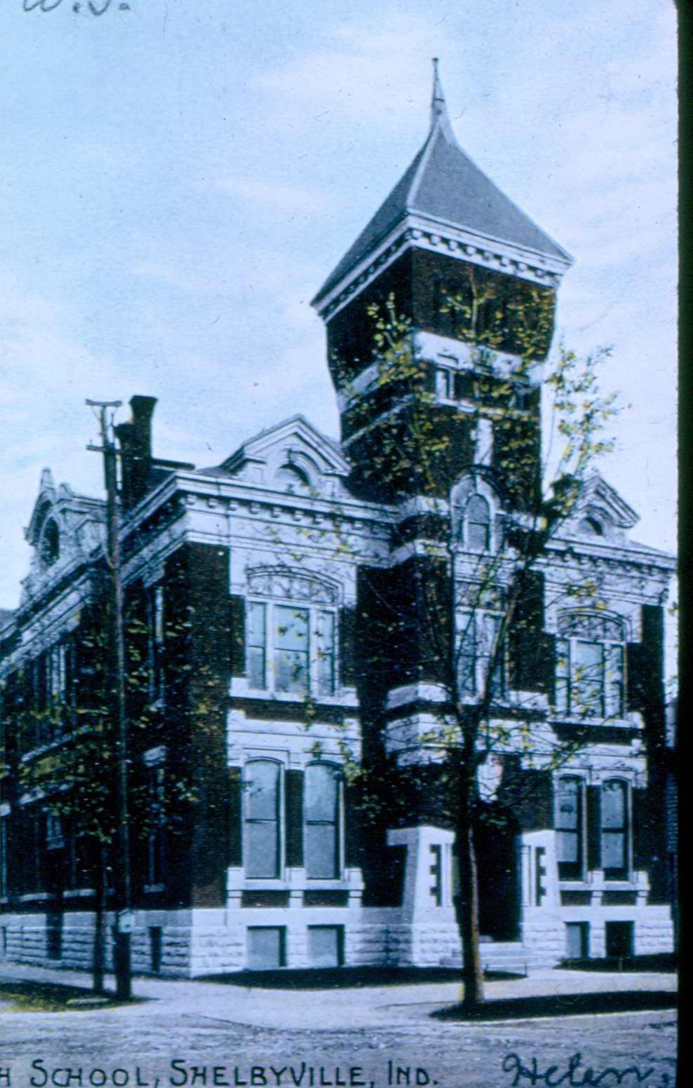 Slide frame is marked: "Old H. School/W. Broadway/Built 1895." Caption on image reads: "High School, Shelbyville, Ind." and the name "Helen"Collection