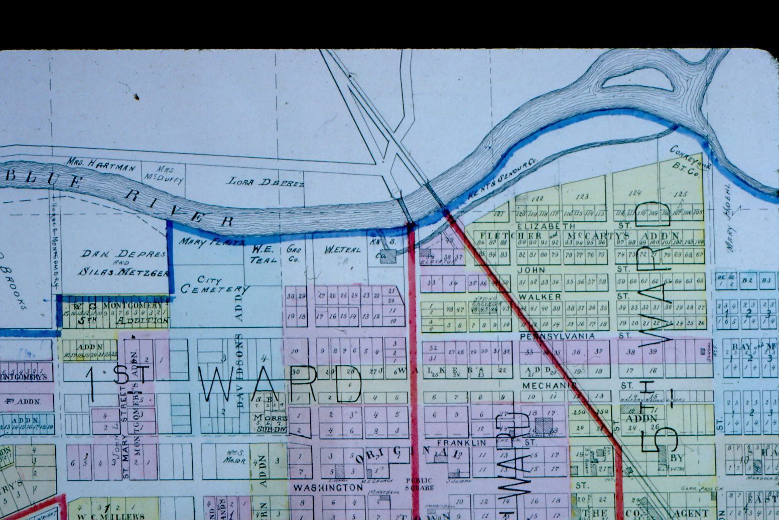 Donation, 07/26/2005. Color photographic slide in landscape format. This is a slide of a map. Slide frame is marked: "Map 1900." Image is a portion of a map of Shelbyville that is divided into "wards."Collection
