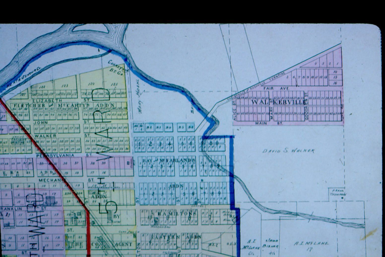 Donation, 07/26/2005. Color photographic slide in landscape format. This is a slide of a section of a map. Slide frame is marked: "Map 1900." This is a section of a larger map showing the division into "Wards" and Walkerville can be seen.Collection