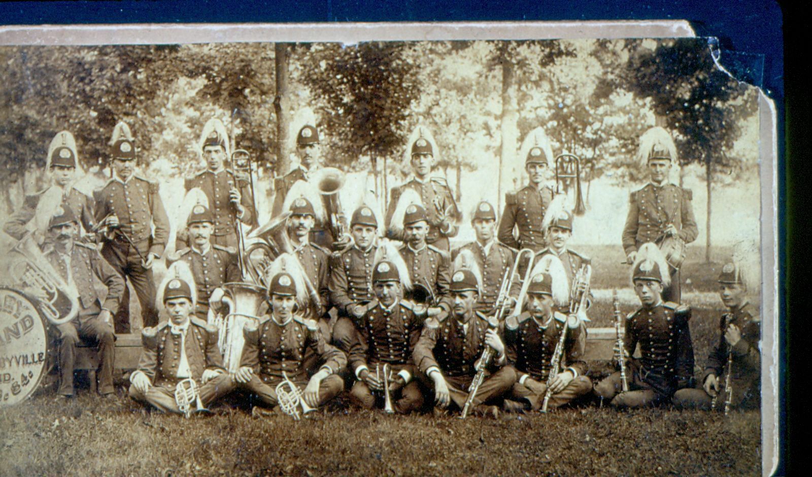 Black and white photographic slide in landscape format. Slide frame is marked: "Shelbyville Military Band."Collection