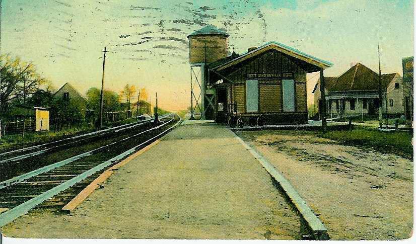 color postcard of Shelbyville Railroad Station; luggage cart by station and a water tower behind it; some other frame buildings visible on either side of station. The station is a small frame structure upper left part of card has red lettering "J.M. & R.R. Depot, Shelbyville, Ind."