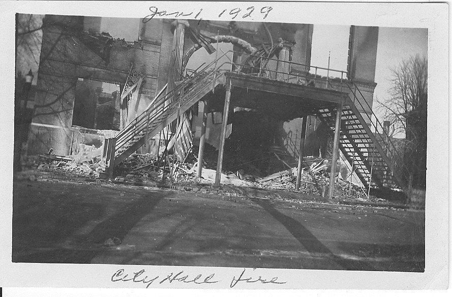 Collection of Norman Morris, son of Russell & Hilda Morris. Donation, 1997. 2.75" x 4.5" glossy, black and white photo in landscape format. Image shows the City Hall Building after a devistating fire. View is from across the street and shows a close up of the front stair cases.Collection