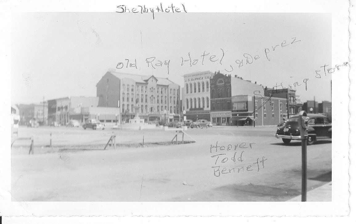 Collection of Norman Morris, son of Russell & Hilda Morris. Donation, 1997. 3.5" x 5.5"" glossy, black and white photo in landscape format. Image shows shows the North East segment of the public square. Featuring the Ray Hotel, J.G. Deprez, and Bocners Electric.Collection