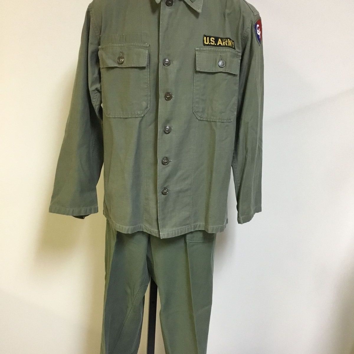 National Guard uniform shirt, olive green with emblems. White emblem on right side of collar. Green and yellow emblem on left side. A red, blue and white emblem on left sleeve. Brown buttons down front and on pockets. John Soller was in the National Guard, bomb insignia is for Ordinance Division. Find description of pants on 2006.115.002Use