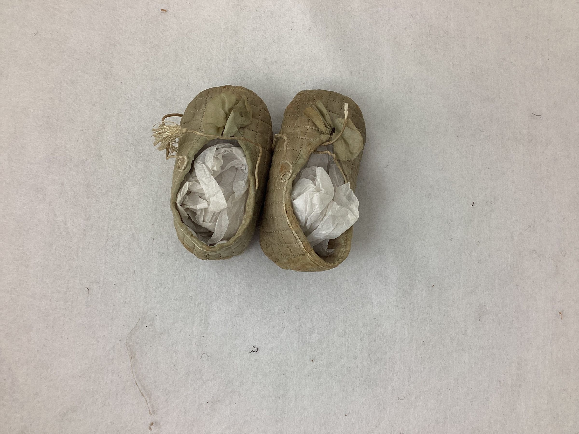 Pair of baby shoes; light blue silk quilted; silk bow in front; tied with silk cord.