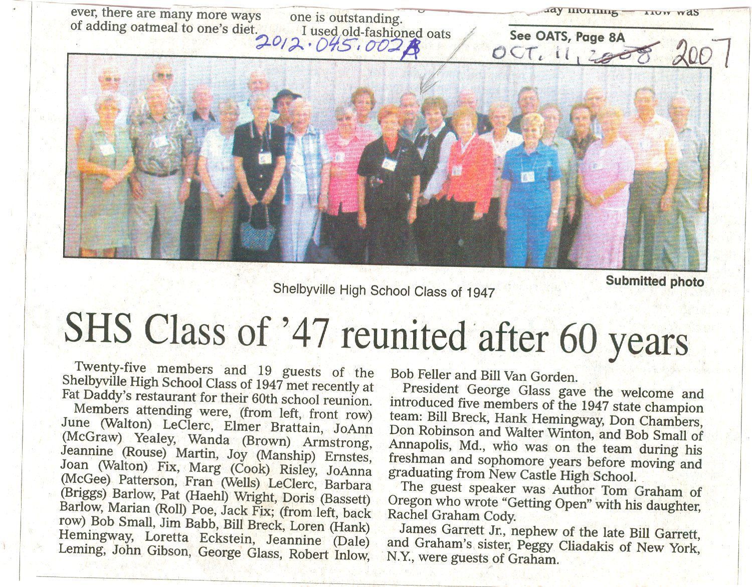 Newspaper articles, a color photograph of Shelbyville High School Class of 1947, commemorating the 60-year reunion. Narrative tells brief provenance of the class, and identifies persons in the photograph.Collection