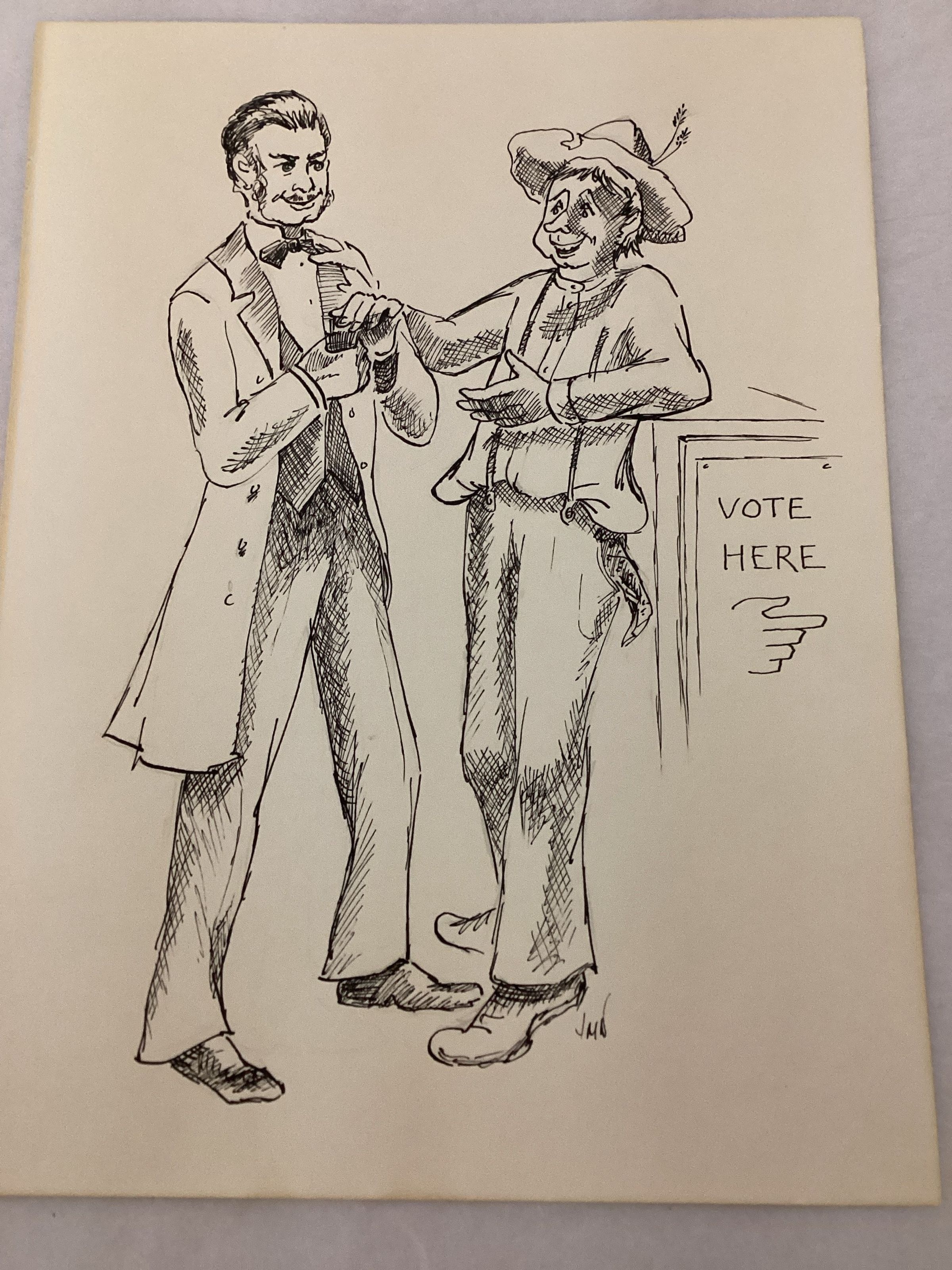 Sketch titled “Vote Buying”, for “Shelby County Riled Up”, book by John R. Wetnight, published 1971. Appears on page 78Artwork Details