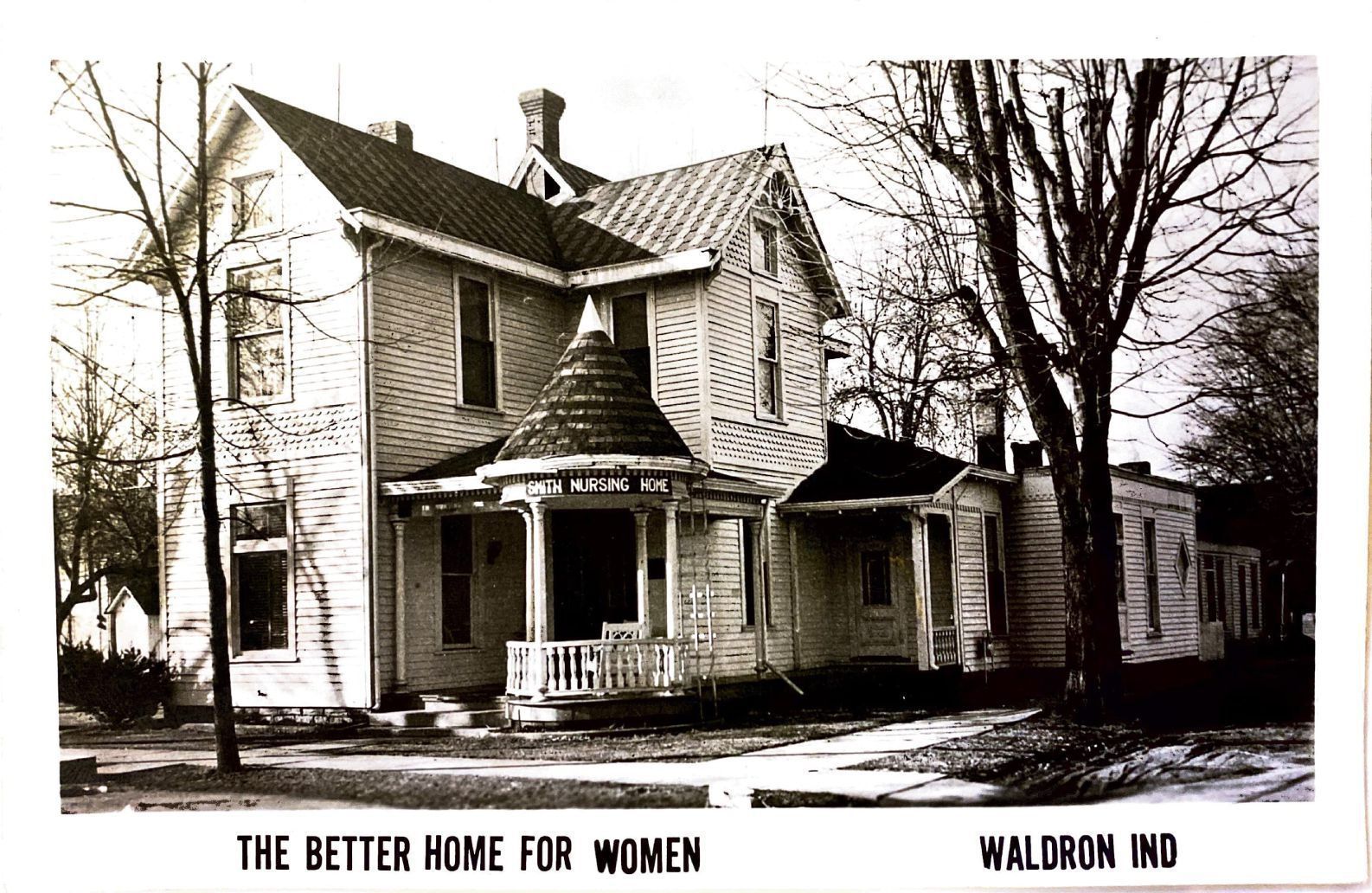 A black and white photographic postcard depicting the façade and grounds of the Smith Nursing Home in Waldron, IN. Several tall, barren trees are visible in front of and behind the nursing home and cement sidewalks run between patches of grass in the foreground of the photograph. The nursing home is a large white structure with a dark shingled roof and various trims. At the front of the building is a small covered porch with a white rocking chair sitting on it. Along the top trim of this covered porch reads in white type: SMITH NURSING HOME. A white border surrounds the photograph. At the bottom of the border in black type reads: THE BETTER HOME FOR WOMEN -- WALDRON IND.