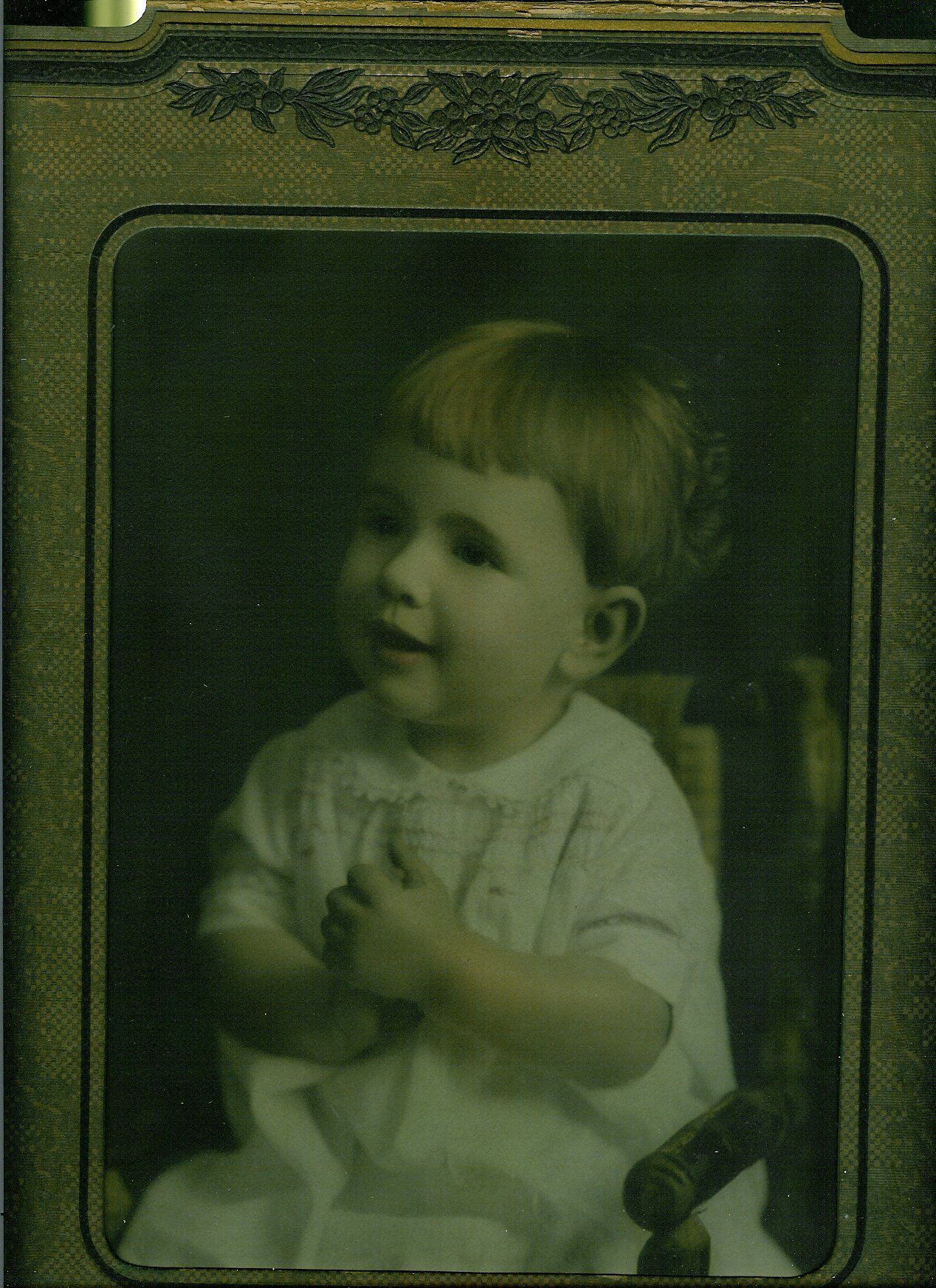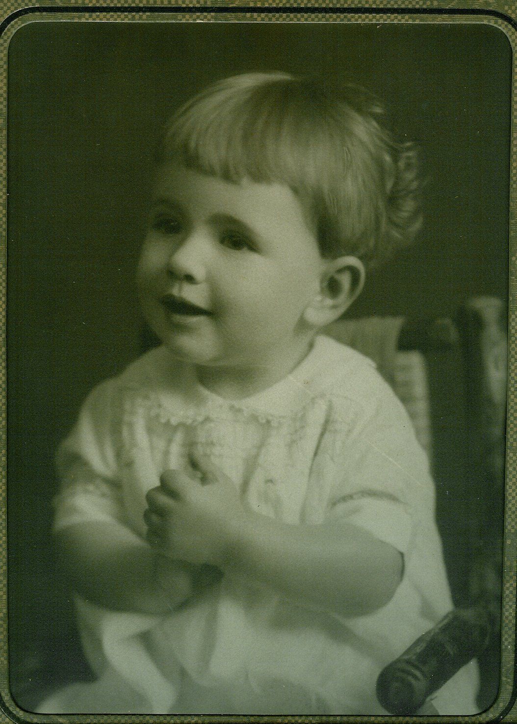 A: Black & white photo of young female child, left side to camera, light hair w/ curls in back, white dress w/ lace trim on collar, elbow-length sleeves. Sitting in wood chair w/ rattan back. Identified as Shirley Smith, daughter of Harry & Nondas Smith. B: Sepia-tone, colorized photo identical to A.Collection