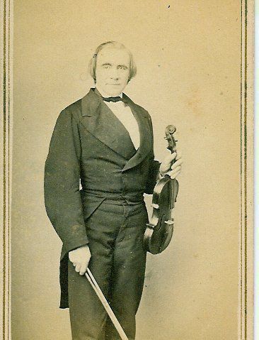 Image is of a standing man; hair is parted on left side and combed down over the ears; man is wearing formal attire; white shirt has stand up collar with short wing tips; small dark bow tie; coat has wide lapels and "Tails"; man is holding a violin in left hand and bow in right hand; mounting is of white cardboard with narrow gold stripe near all edged; edged are straight; corners appear to have been square when newer; this is a carte d'visite photo in B&W. printed on back of mounting: "Published by /E. & H. T. ANTHONY, 501 BROADWAY. FROM PHOTOGRAPHIC NEGATIVE in Brady's National Portrait Gallery".Collection