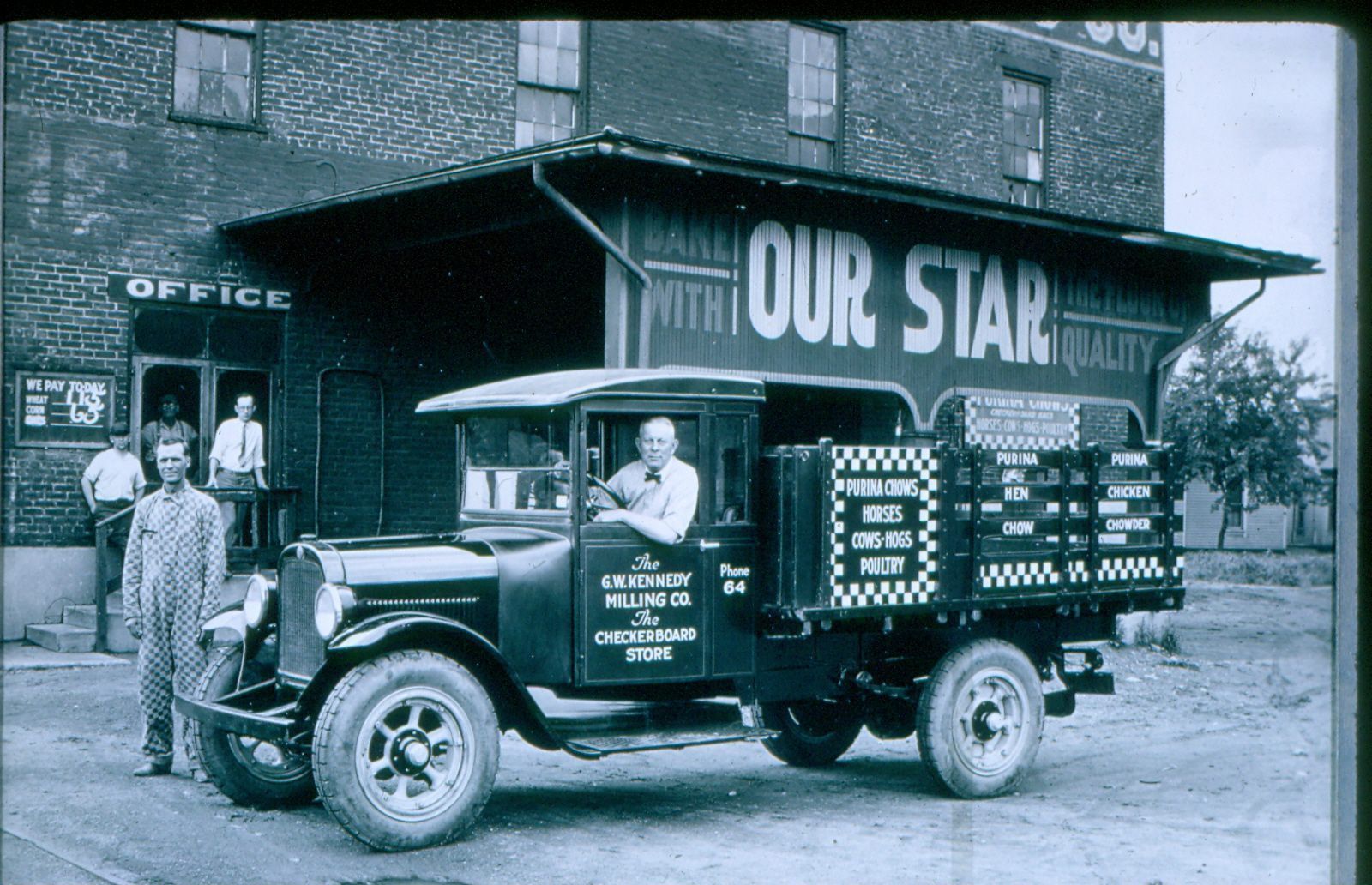 Donation, 07/26/2005. Black and white photographic slide in landscape format. Image is of a truck and on the driver's door is: "Brandywine Bridge/on Michigan Road."The/Checkerboard Store." On building in background: "Our Star"Collection