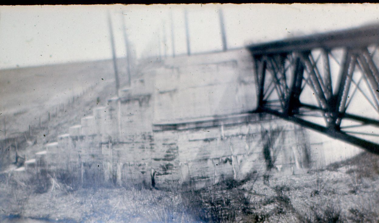 Black & white; center of image shows large concrete abutment w/sides arranged stair step fashion; right side shows iron or steel truss work supporting span for railbed bridge; utility poles on both sides of railbed.