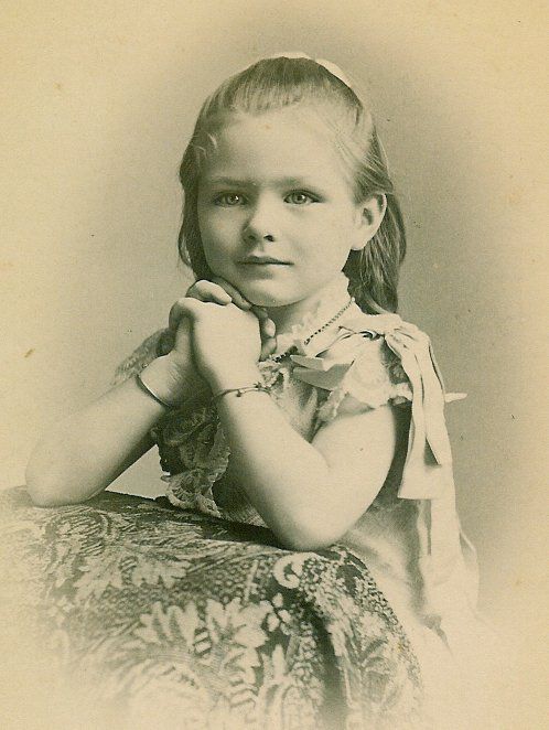 Maker: G. A. Goodrich. Used by: Ethel Tyner Stout. Marks: Bottom of mount printed "G. A. Goodrich, Shelbyville, Indiana". B & W cabinet print. Subject is young girl (under 10 yrs). Has elbows resting on draped studio prop, hands clasped w/ fingers interlaced under right jaw. Wearing bracelet on each wrist. Hair is pulled back from face and hangs loose down back. Has light -colored eyes. Wearing short-sleeve garment not much detail visible. Does have lace collar. Also on front some sort of ribbon work on left shoulder, hangs behind the arm. Wearing strand of dark beads. Late 19th century. Inscription on back of mount reads: Ethel Tyner Stout.Collection