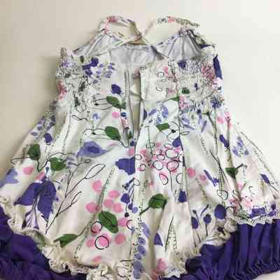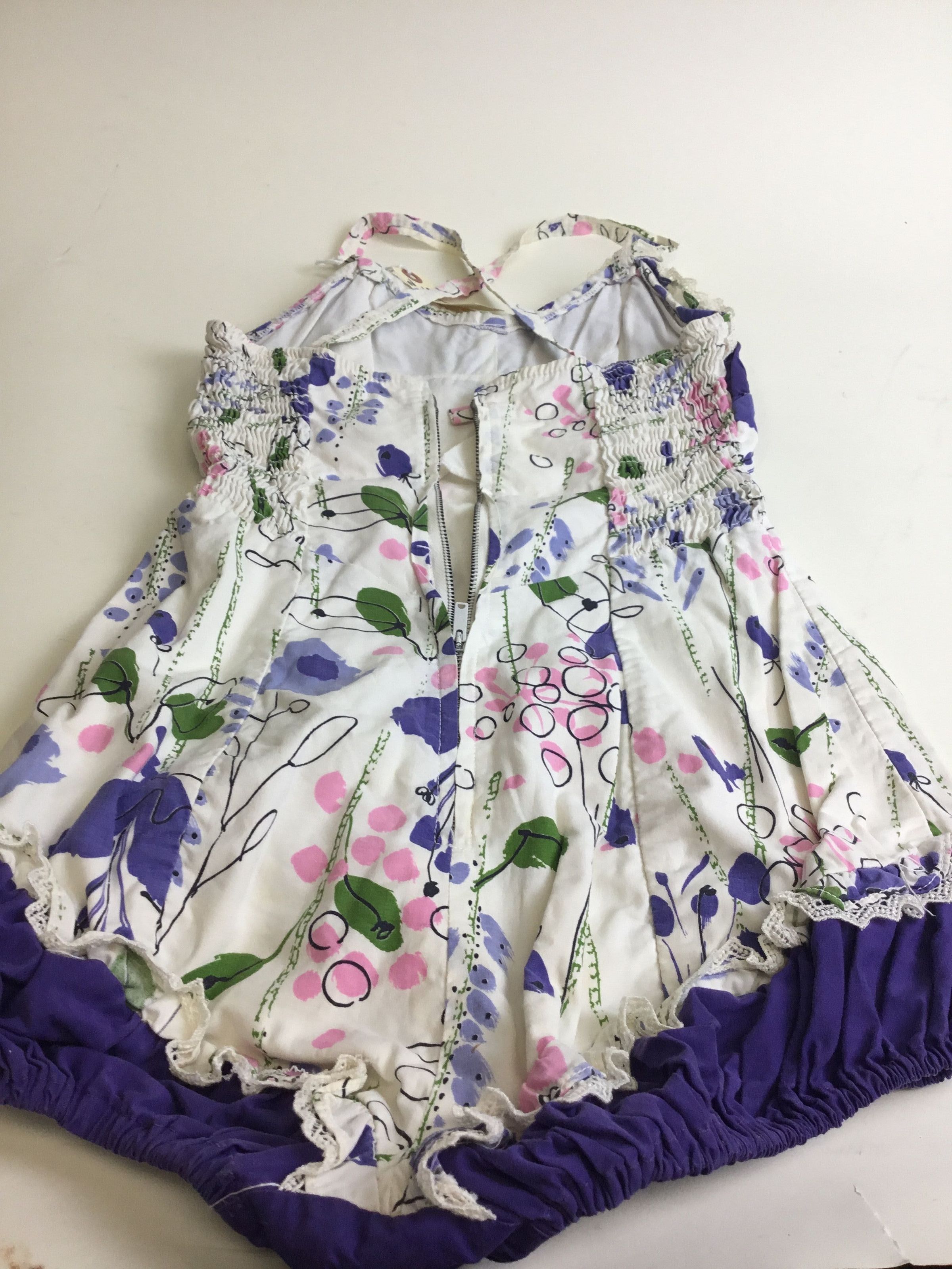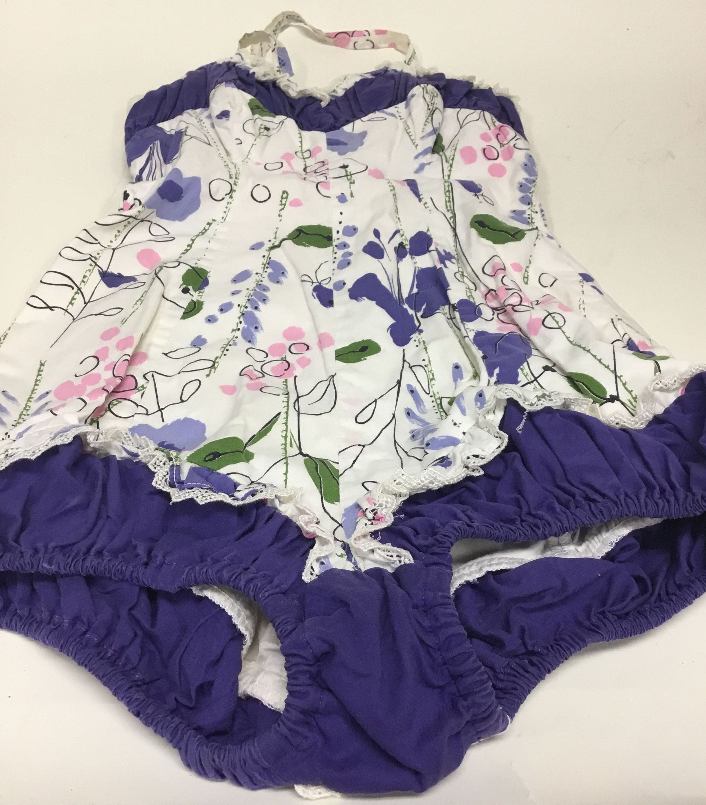 1940’s Jantzen floral print bathing suit. The bodice is edged with purple gathered cotton fabric and this is edged with a strip of the floral fabric, edged with white lace. The floral print is in colors of green, pink, purple, black and green on a white background. The bottom is the purple fabric and outlining this is the floral fabric and lace. The top straps are crossed in the back and there is a zipper running down almost the full length of the suit.Context