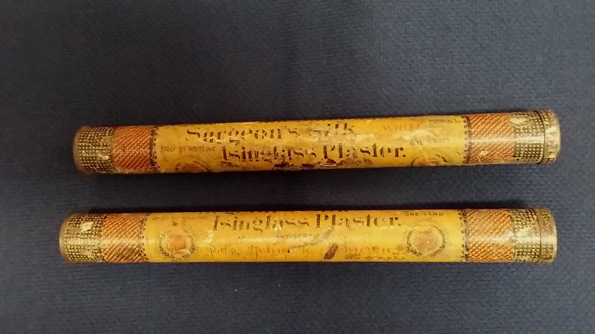 One tin reads : " Surgeon's Silk Isinglass Plaster. Flesh. One Yard. Manufactured by Johnson & Johnson. New Brunswick, N.J. USA. Apply by Moisture." Other was made in New York, USA.