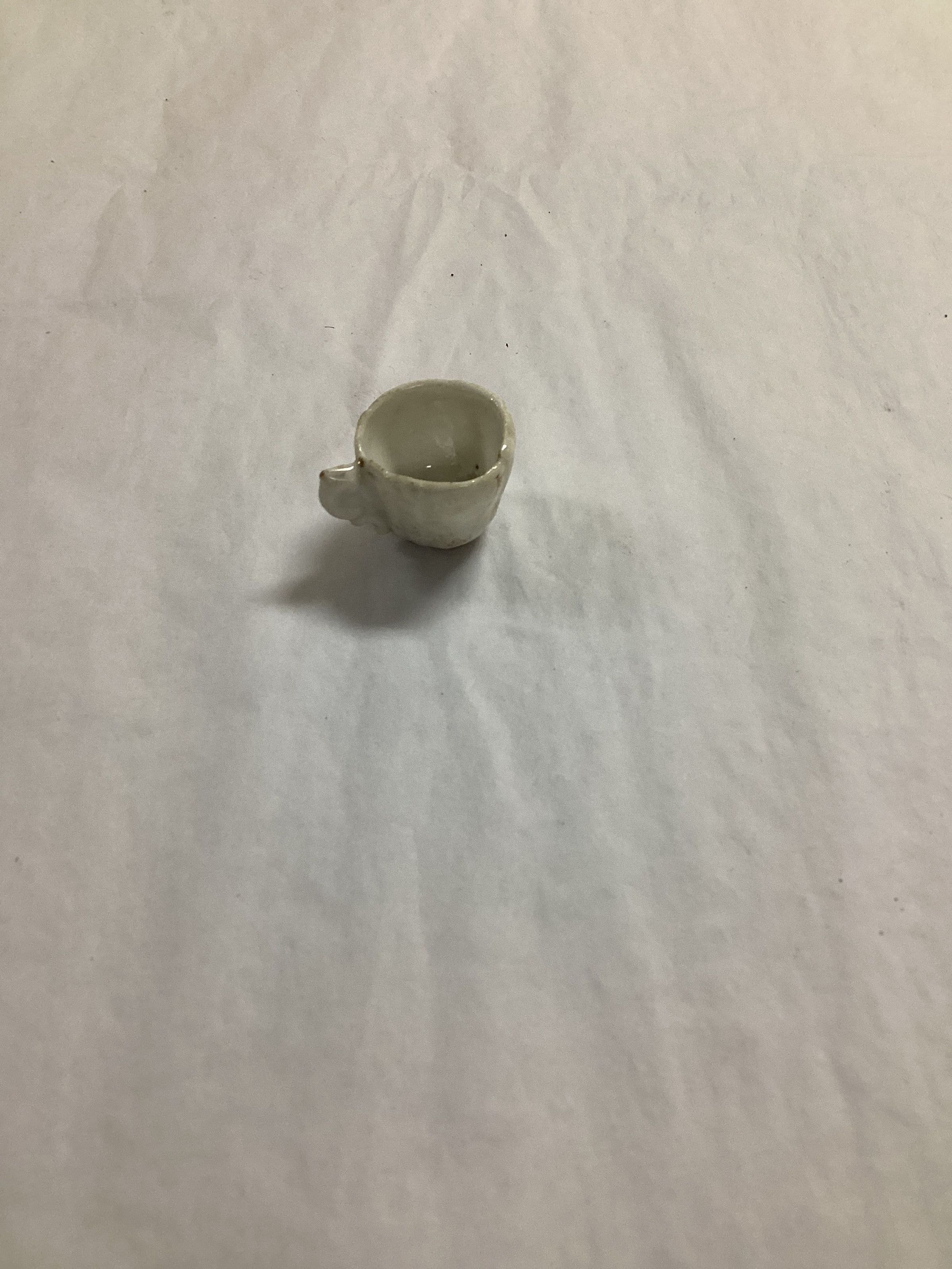 Teacup, doll-size, white ceramic with shiney glaze, vertical lines dividing into panels or ribs, signs of gold trim around the rim, rim is uneven, handle is solid.