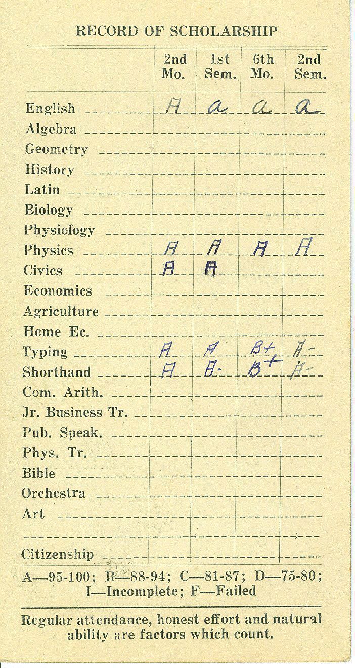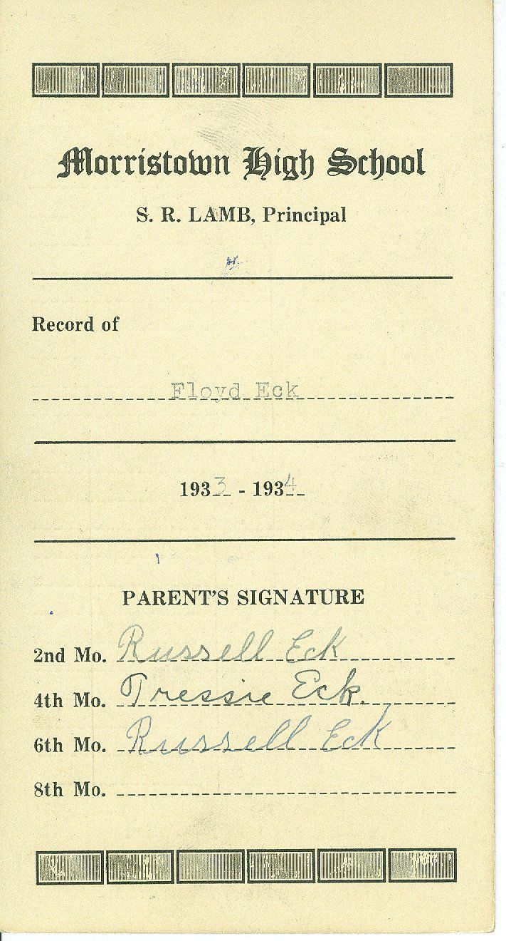 Single page, double sided term card for Floyd Eck for the 12th grade at Morristown High School. The front of the card has lines for monthly parent signatures, signed in both pencil and ink by Russell and Tressie Eck. On the back of the card are montly grades in a grid arrangement with subjects on the left, term months across the top, and corrolating grades written in ink and pencil.Collection