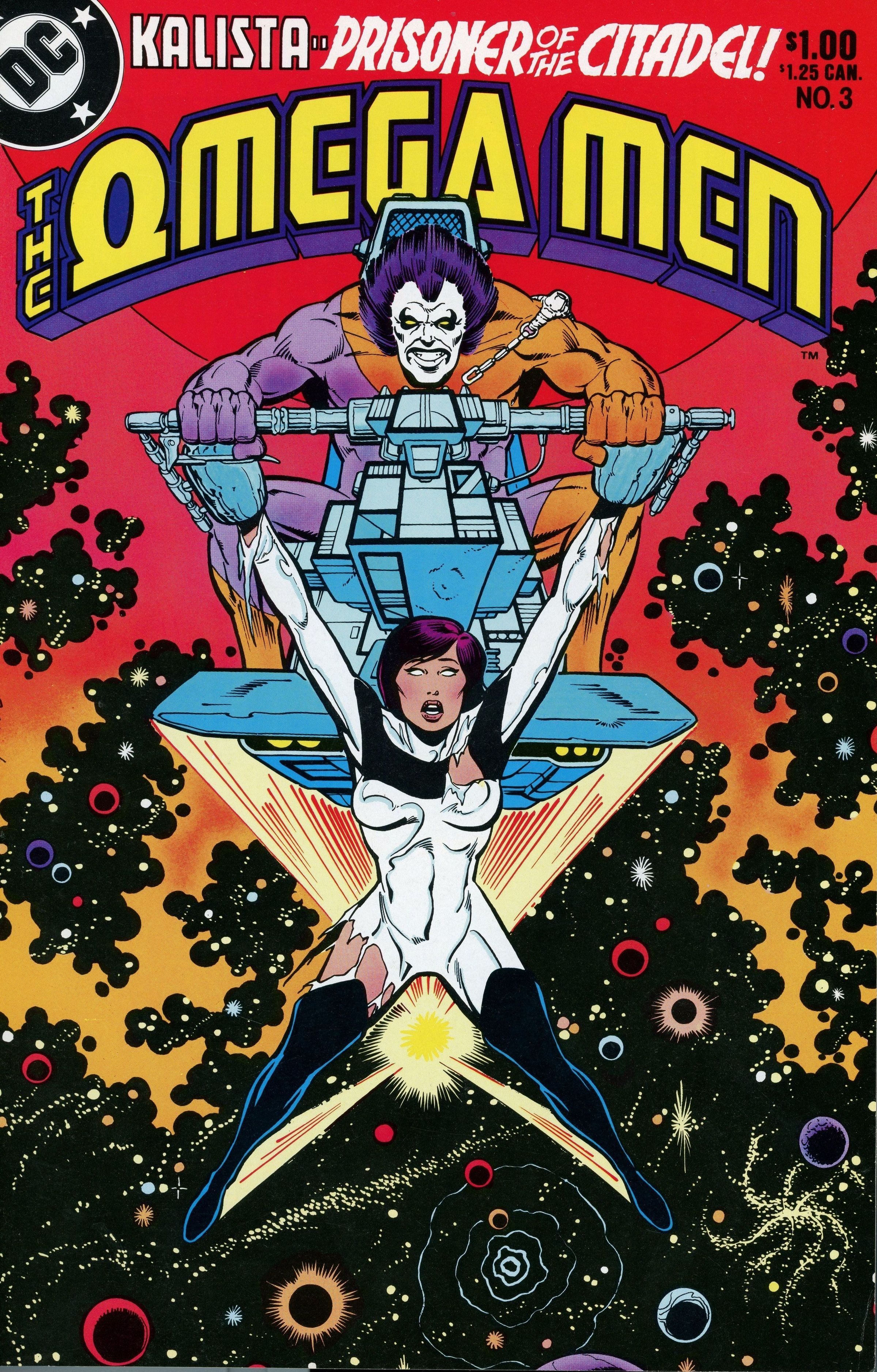 A comic book, with the title "The Omega Men" in yellow stylized font. A red-to-yellow ombre fades into black galaxies. Lobo, a pale figure with black makeup and purple hair, rides a futuristic motorcycle towards the viewer, with a woman, Kalista, restrained to the handlebars. Kalista is red-headed and wearing a torn white bodysuit with black accents and boots. A black DC logo sits in the top left, and it reads "$1.00" in the top right corner, alongside a "No. 3", delineating that this is the 3rd in the series.Context