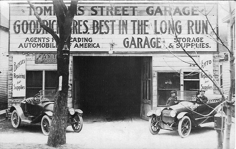 Donation, 07/26/2005. Black and white postcard in landscape format. Nothing is written on back. Image is of a building, open garage door, window on each side of garage door, autos parked on each side of garage door. Two men with auto on right. On the building: "Tompkins Street Garage/Goodrich Tires. Best in the Long Run/Agents for leading/Automobiles of America/Garage/Storage/& Supplies/Bicycles/Repairing/and/Supplies/Auto Repairing and Supplies"Collection
