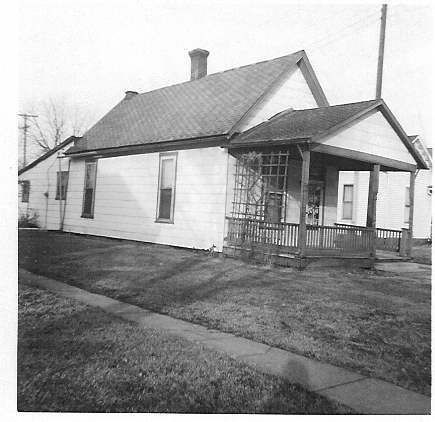 Black and white snapshot; frame house, clapboard siding;nodified shot gun style; long narrow house with pitched roof and brick chimney' 2 high narrow windows on side, 1 high narrow window and door on front of house; roofed porch is probable and addition, porch roof supported by at least 3 posts, has railing around porch and one end has a trellis; there is a lean to addition to back of house that has 2 small windows.Back inscribed inblue ink; "South Harrison St/W.Side just south of Van/Ave. Once toll house for/"Shelbyville Norristown/Turnpike"
