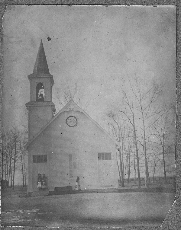 black and white photo mounted gray cardboard; image is of a frame church with clapboard siding; has a peak roof and looking at a gable end; there is a 6 panel window in center of gable end and a door way on either side of the window; each door has a transom; door on left side of print has steps to it; 4 people standing on steps and another person near the window; bell tower is visible; there is a circular area under the peak and lettering reads: "TONER'S/M.E. CHAPEL"; trees are bare