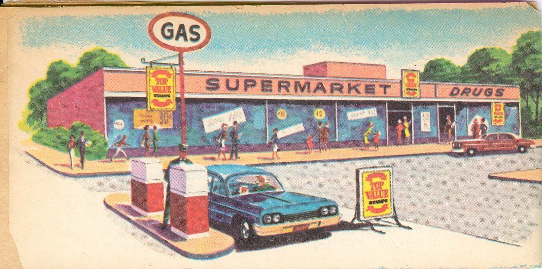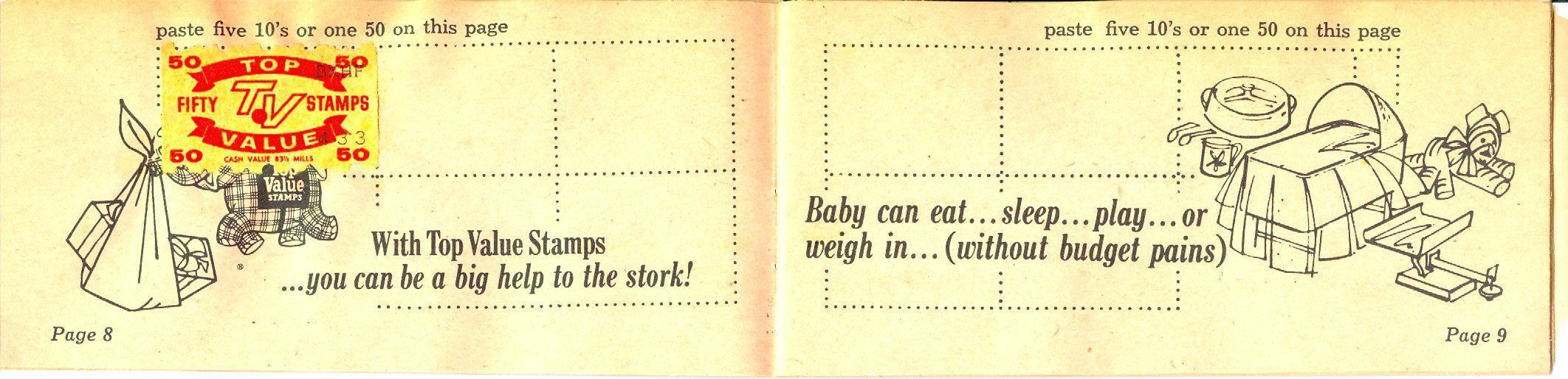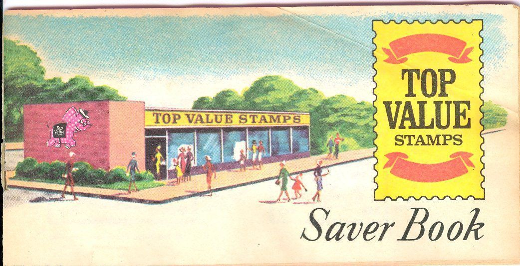 Top Value Stamps Saver Book; full-color printing on cover front & back. Inside pages black type & graphics. Pages 1-31 have grid layout to show placement of the stamps. The coupon/stamps are bright yellow background with bright red type.