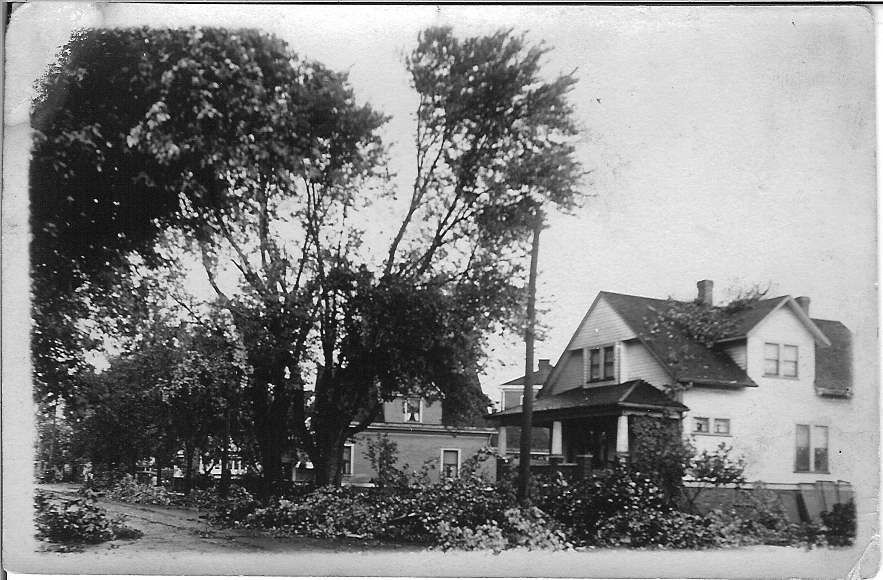 Donation, 07/26/2005. Black and white matte photographic print in landscape format. Image of tornado damage. On back: "E. side of S. Harrison St./near R.R. crossing."Collection