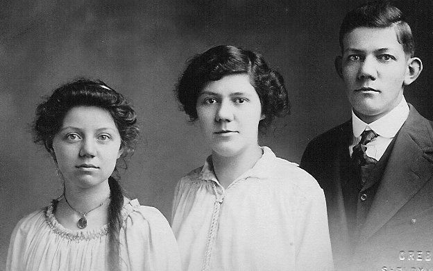 Black and white photographic print in the form of a postcard. Image is of two young women and a young man. Woman on left has dark hair pulled back off face and one very long curl draped over her left shoulder, necklace with a dark pendant; white garment with a gathered neckline. Center woman has short dark hair parted on left and curled at sides; wearing a white garment with small collar. Man has dark hair parted on left, white shirt, dark tie, dark vest, dark suit jacket with wide lapels. [These people may be connected to the Beaumont and/or Totten family in 1998.054 and 1998.055]. Photographer's mark: "Orebaugh/Shelbyville, Ind."Collection