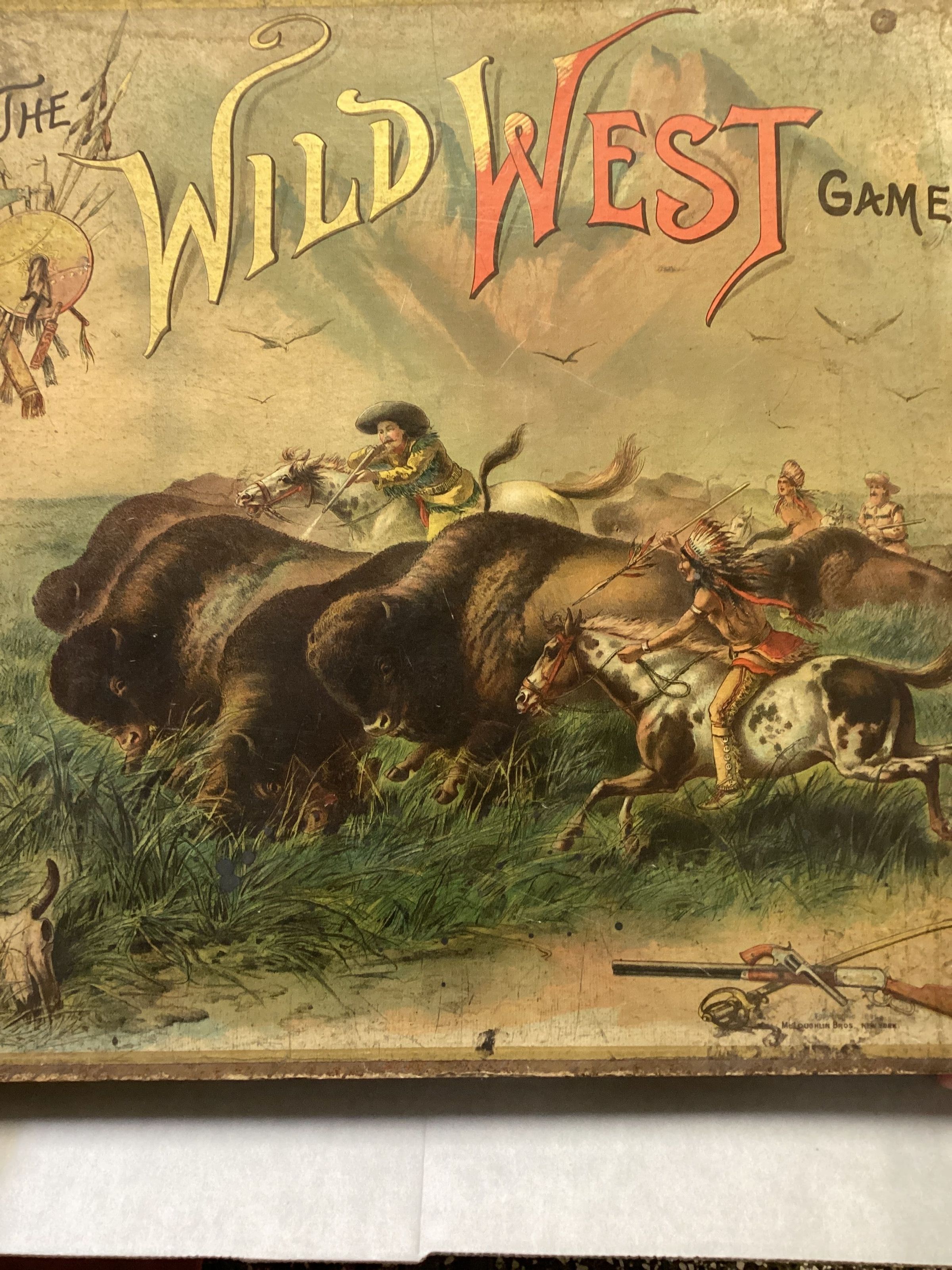 "THE WILD WEST GAME" is a cowboy and Indian war game for two players. Board is made of wood covered with colored lithograph paper, depicting Indian village, army fort, the calvary, Indians on horseback, stage coach and covered wagons. Playing token consist of 8 lead Indian figures and 7 lead cowboy figures, 2 red wooden dice cups. The cardboard lid has a color lithograph depiction buffalo hunt. The rules of game printed on underside of lid. McLoughlin Bros, New York Lower right corner of lid. Piecesof game are subnumbered 1985.001.021A through .001.021RCollection