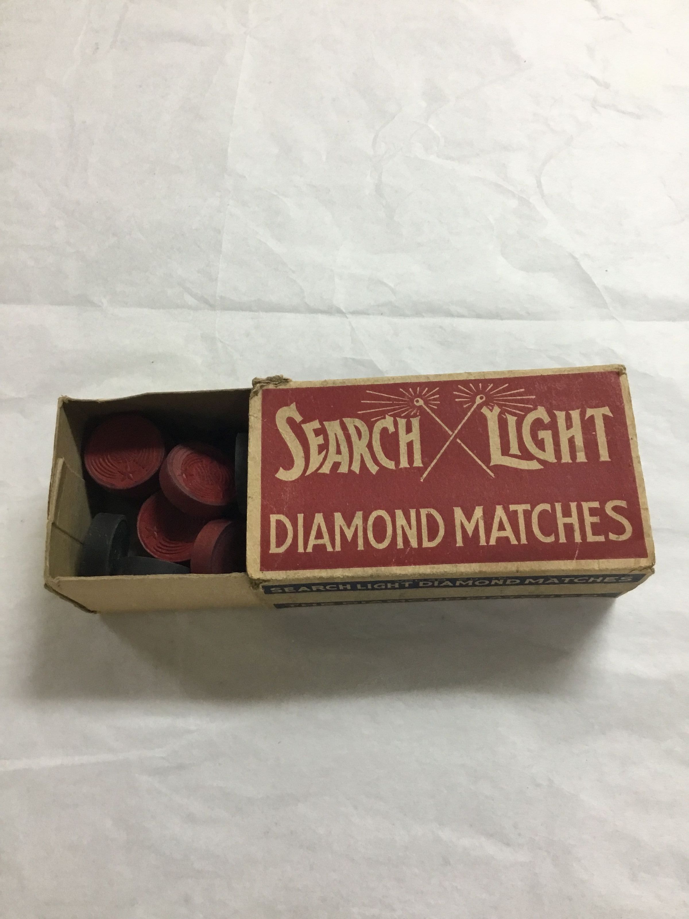 Toy 13 black checkers, 12 red checkers - stored in Diamond match box. Box is 4 3/4" long 2 1/2" wide box is red, blue, cream in color.