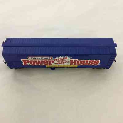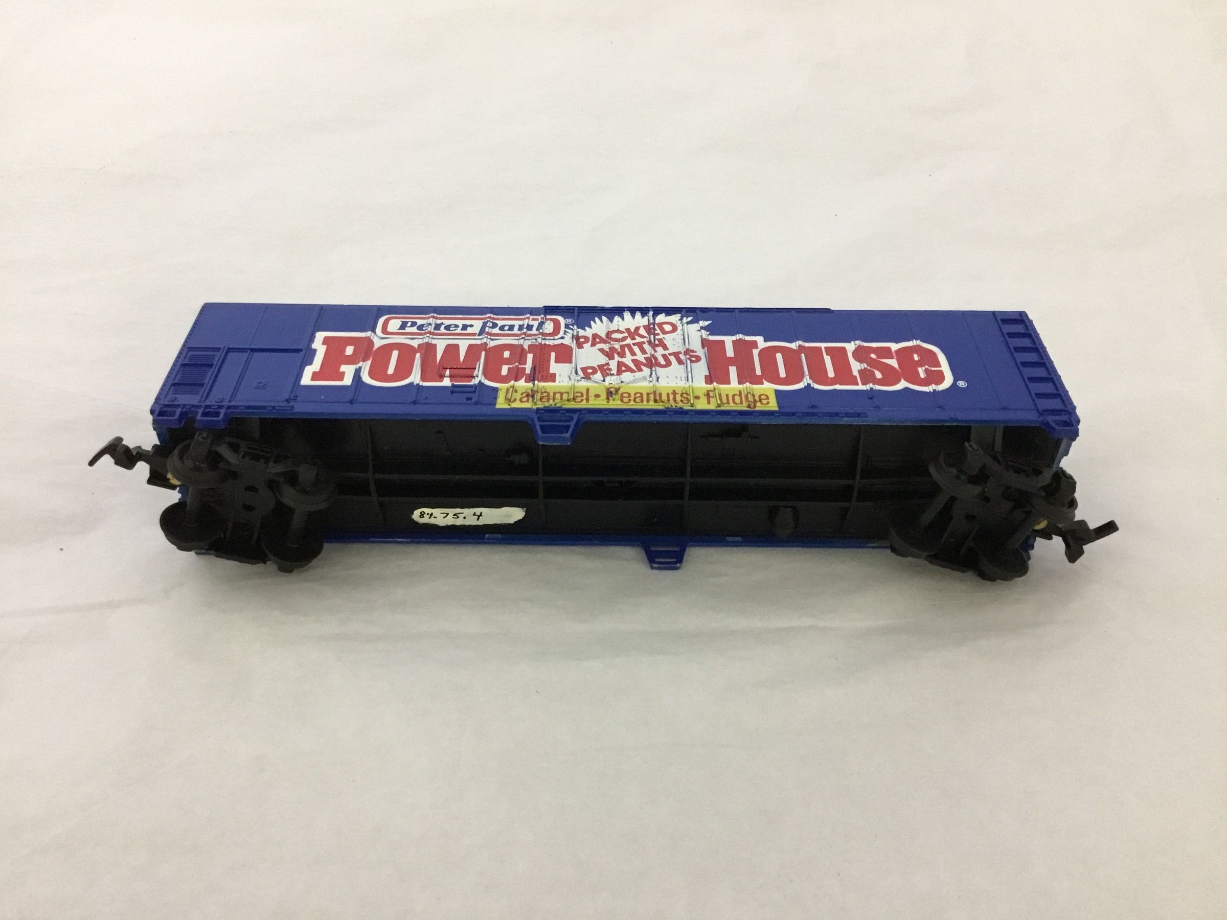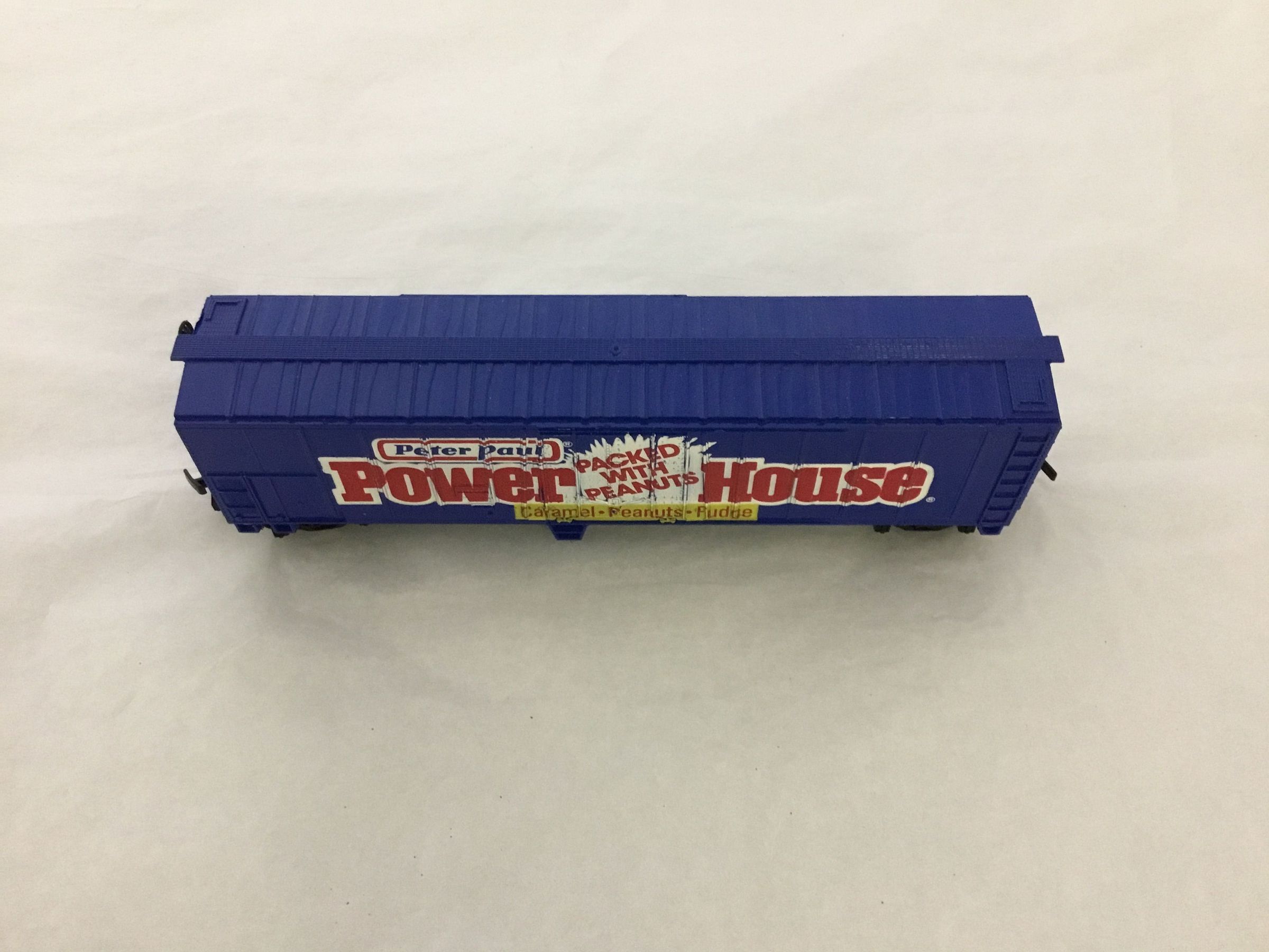 Louis Kuhn purchased for the museum so there could be a train running during the 1984 Christmas Toy Train Show; part of a complete set known as the "Yard Boss". Underside is marked "BUCHMANN, HONG KONG" toy railroad car; HO scale reefer; blue color; has molded details such as rivets; catwalk on the top; open rung steps on the sides; ladders on the ends; and one end has a black hand brake; sides have the tradsmark for Peter Paul Candies; also on sides in red letters against a white background is "POWER HOUSE" and between those words is "PACKED WITH PEANUTS"; in red letters against a yellow backgroung is "CARAMEL.PEANUTS.FUDGE"Collection