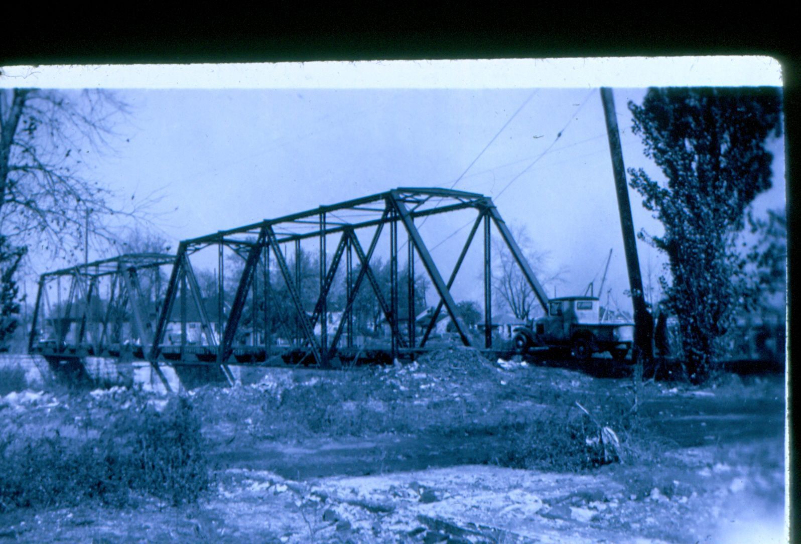Donation, 07/26/2005. Black and white photographic slide in landscape format. This is a slide of a photograph. Slide frame is marked: "Autos crossing Interurban/Bridge across Blue River/late 1936/Runaround damaged/ auto bridge/by flood/Laid planks and used Traction Bridge."Collection