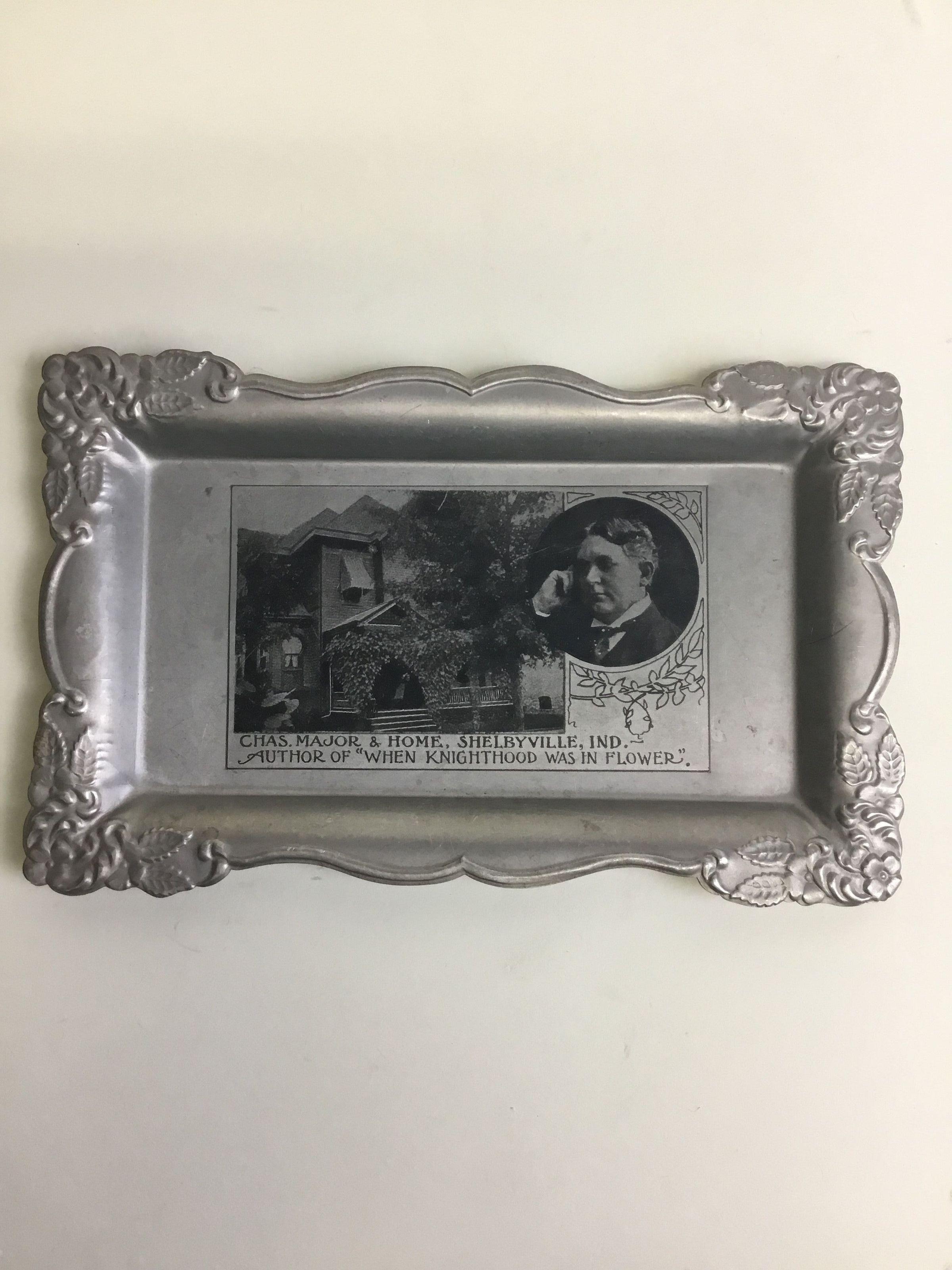 A souvenir pin tray made of stampted metal; the cormers are decorated in a floral and leaf pattern; the bottom of the pin tray is black & white lithographed with an image of Charles Major's home and a circular inset likeness of Charles Major in the uppe right hand corner bottom of image is printted "CHAS. MAJOR & HOME, SHELBYVILLE, IND. AUTHOR OF 'WHEN KNIGHTHOOD WAS IN FLOWER'