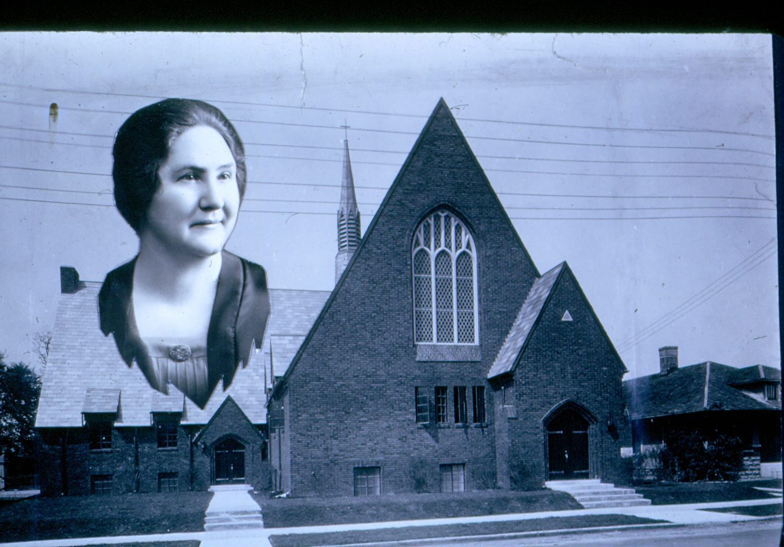 Black and white photographic slide in landscape format. Slide frame is marked: "Walkerville Church." This is Trinity Church. The Rev. Mrs. Josephine Huffer was the pastor.Collection