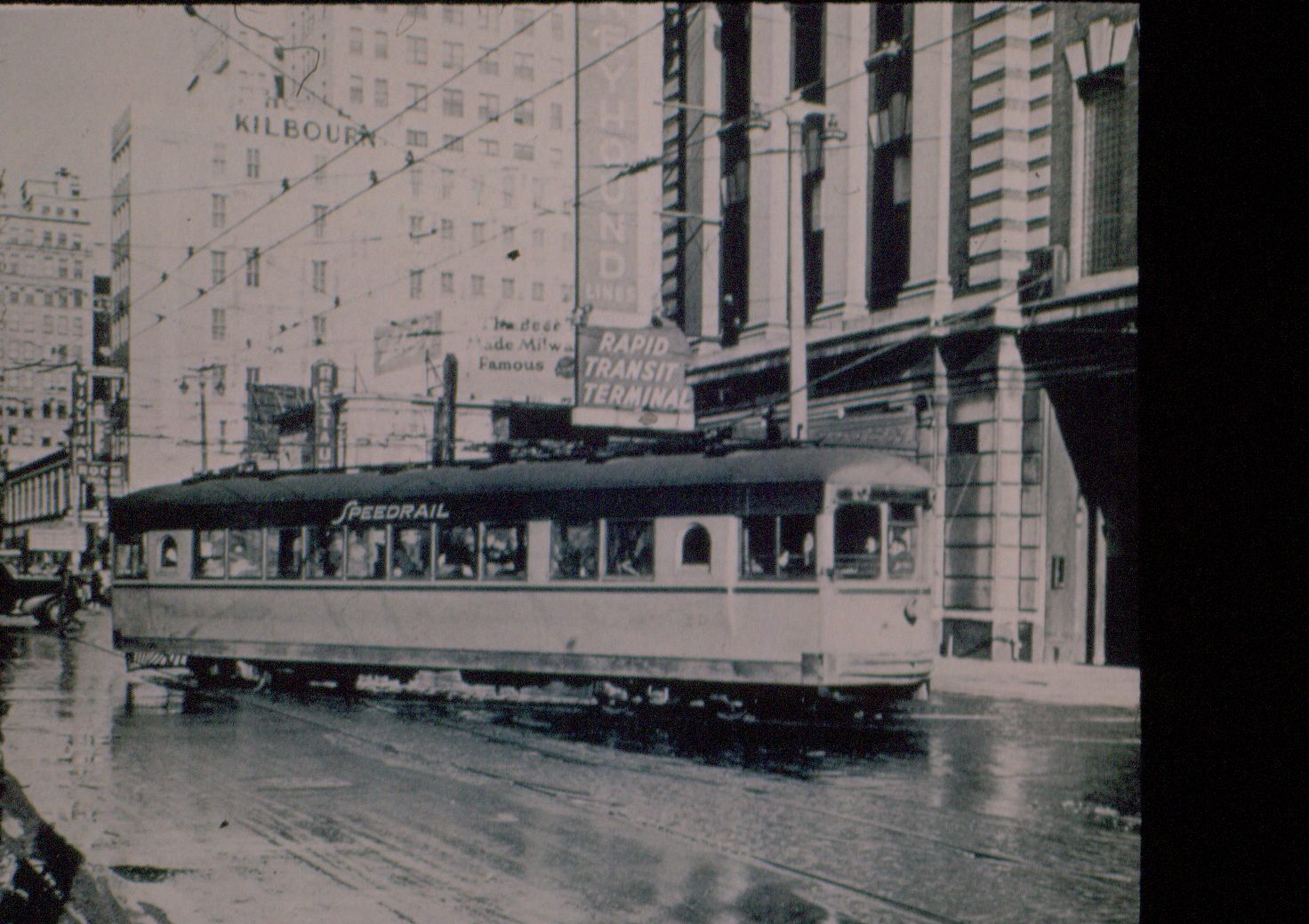 Black & white; copystand dot printed image; urban street scene focusing on trolley car turning a corner; roof is darker shade than main body, there is a narrow stripe just below windows that matches roof shade; 2 arched windows visible on side; lettering above windows reads "Speedrail", rear collector arm is up; tracks are in brick street but rest of surface appears asphalt paved; passing building with sign "Rapid Transit Terminal" building in background has letters at top Kilbourn"